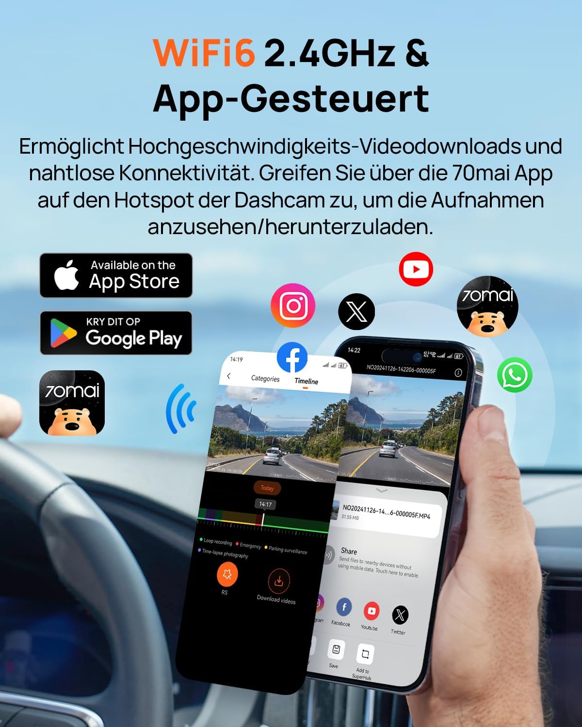 • 【Вграден Wi-Fi и управление чрез приложение】Свържете се с безплатното приложение 70mai чрез вградения 2.4 GHz Wi-Fi. Това ви позволява да регулирате настройките на устройството, да преглеждате записи на живо, да редактирате видеоклипове на iOS/Android смартфони и да споделяте шофьорски преживявания със семейството и приятелите си само с едно щракване. Не е необходимо да боравите с карта с памет. За прехвърляне на данни или архивиране, просто свържете видеорегистратора към компютъра си чрез USB кабел.