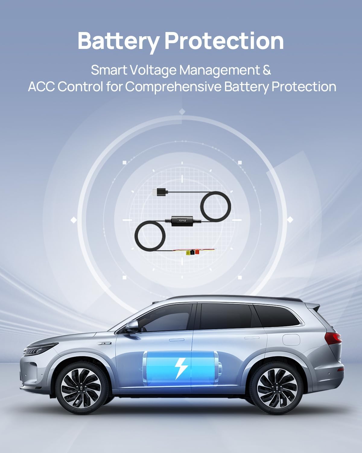 • 【Лесен за употреба и захранване】Комплектът UP03 се свързва към акумулатора на автомобила и може да осигури прекъсващо захранване за 70mai видеорегистратора в продължение на 24 часа, като захранва и когато автомобилът е изключен.