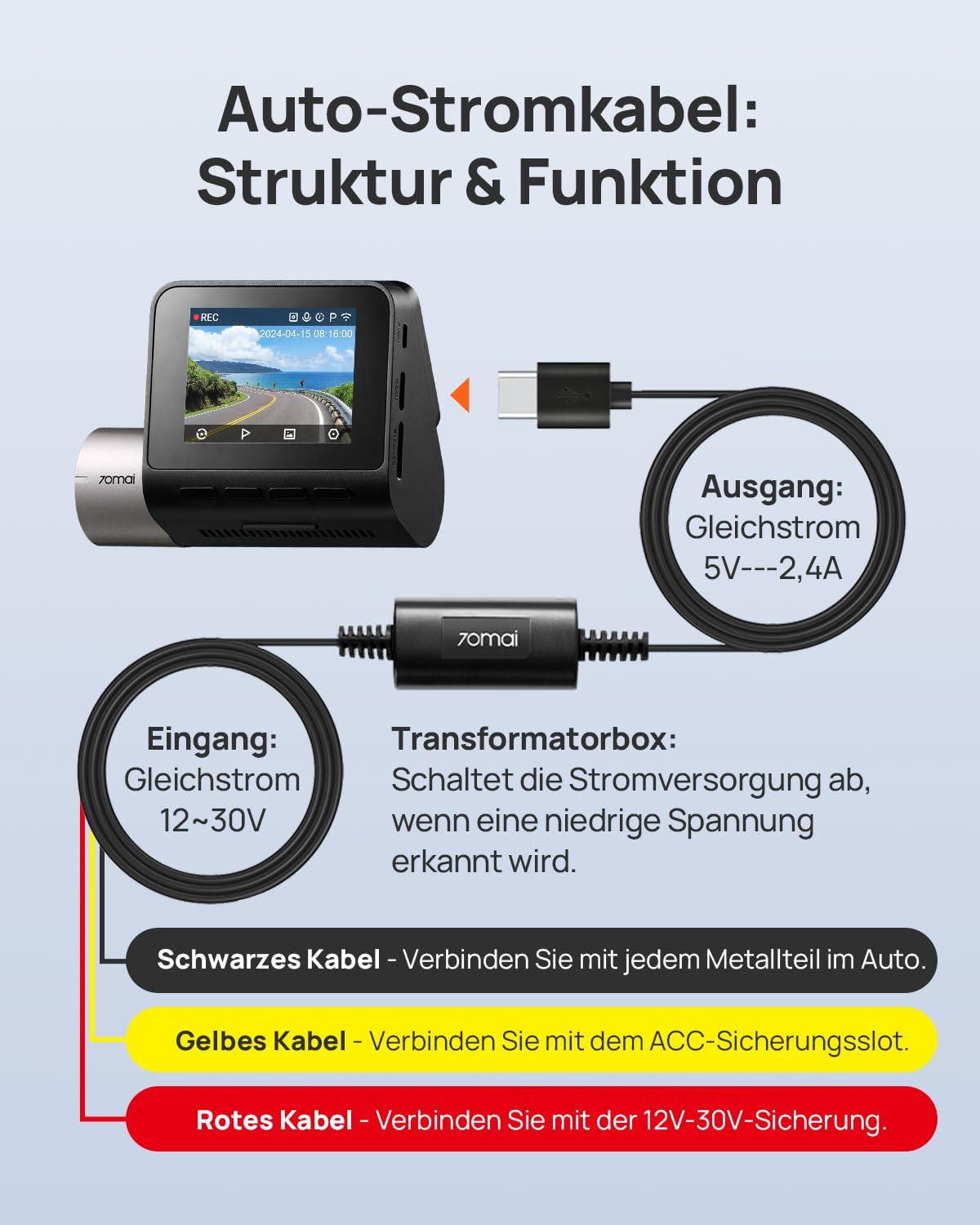 70mai комплект за окабеляване UP03, комплект за окабеляване Type-C с нисковолтова защита, 24-часово наблюдение на паркирането за 70mai видеорегистратор M310/A410/A510/A810/A800SE/4K Omni/T800E/T800, 3 м, 12 V–30 V до 5 V/2.4 A
