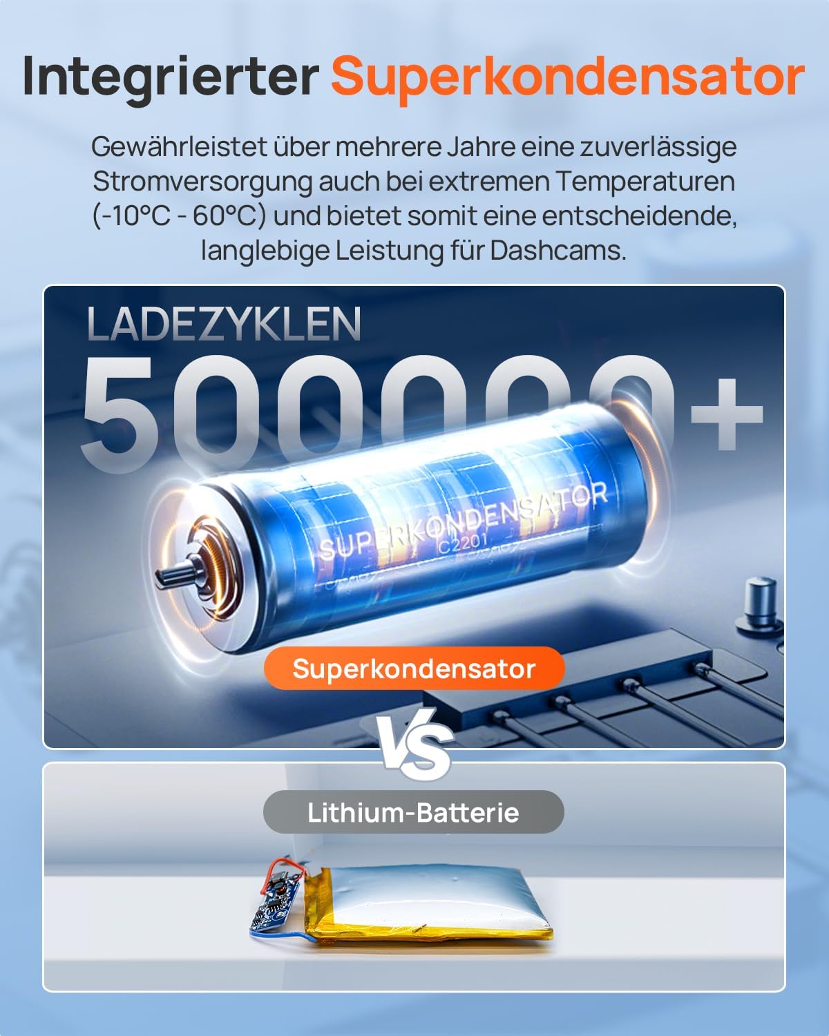 • 【Суперкондензатор за повишена безопасност】Усъвършенстваната технология със суперкондензатори осигурява надеждна работа на видеорегистратора дори при екстремни температури, от летни жеги до зимни слани, и осигурява по-дълъг и безопасен живот. Записите се запазват автоматично в случай на прекъсване на захранването.