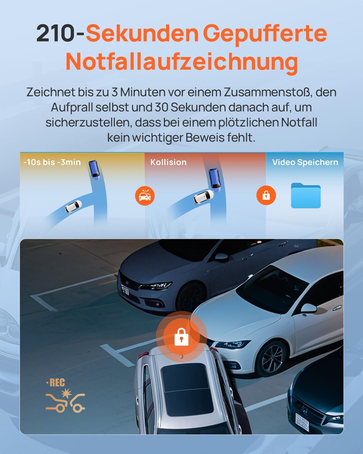 • 【Запис при спешни случаи до 210 секунди】70mai T800E предлага разширен предварителен запис за видеоклипове при спешни случаи. Той автоматично записва 10 секунди – 3 минути преди удара и 30 секунди след това. Тази удължена продължителност улавя ключовите моменти преди и след сблъсъка, предоставяйки пълен контекст. Видеоклиповете се запазват в специална папка за лесно гледане.
