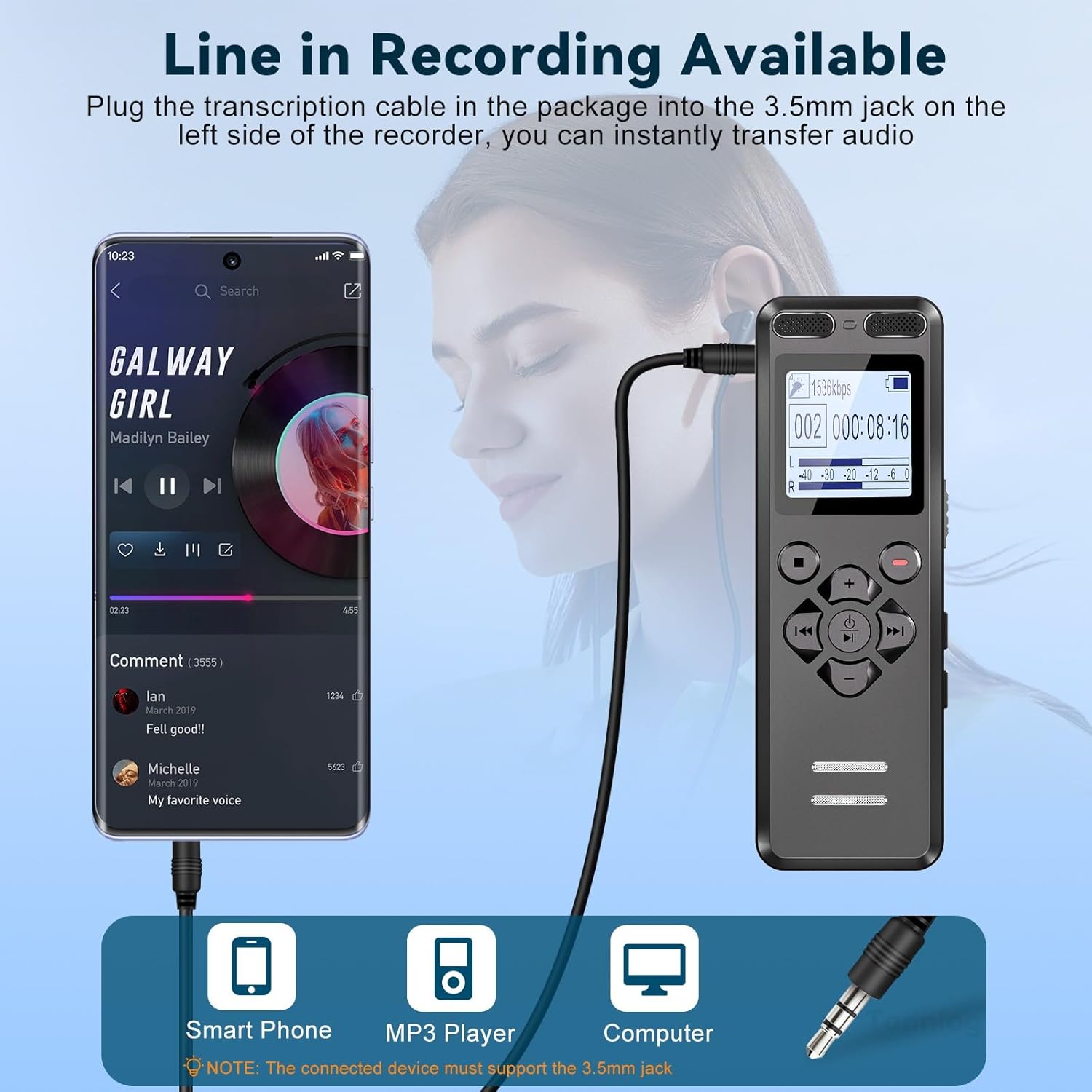 Better sound quality when playback via headphones or computer than via the local speakers of the voice recorder. The recording is interrupted if you connect to a computer or mobile phone during the recording process. For more storage space, we recommend you enter the settings and select the save position to save the recording on the TF card. If the recording and music are in different folders, long press the ''M '' '' key key to the Recording and music folder. The device has two 3.5 mm audio jacks, the right side supports the connection of wired headphones for listening to recordings or music, the left side supports connecting a transcription cable for the line-in