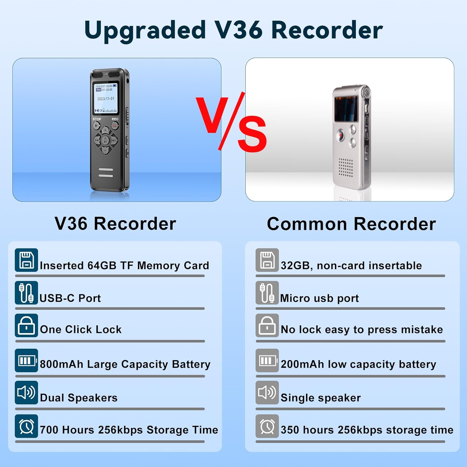 Start / save recording with one button: Dual sensitive microphones 1536kbps recording. USB-C interface: for file transfer and charging, more convenient to use. Large storage capacity: 8 GB internal memory and 64 GB TF card (inserted into the device) as an extension. 800 mAh rechargeable battery: 2 hours for a full charge for 55 hours of continuous recording at 512kbps or 85 hours at 256kbpsMultifunctional: One-touch lock, quick deletion with one click, variable speed playback, A-B repeat, timer recording, voice activation, password protection...Complete accessories: including earphones, transcription line, OTG adapter, USB-C data cable, manual and online learning video