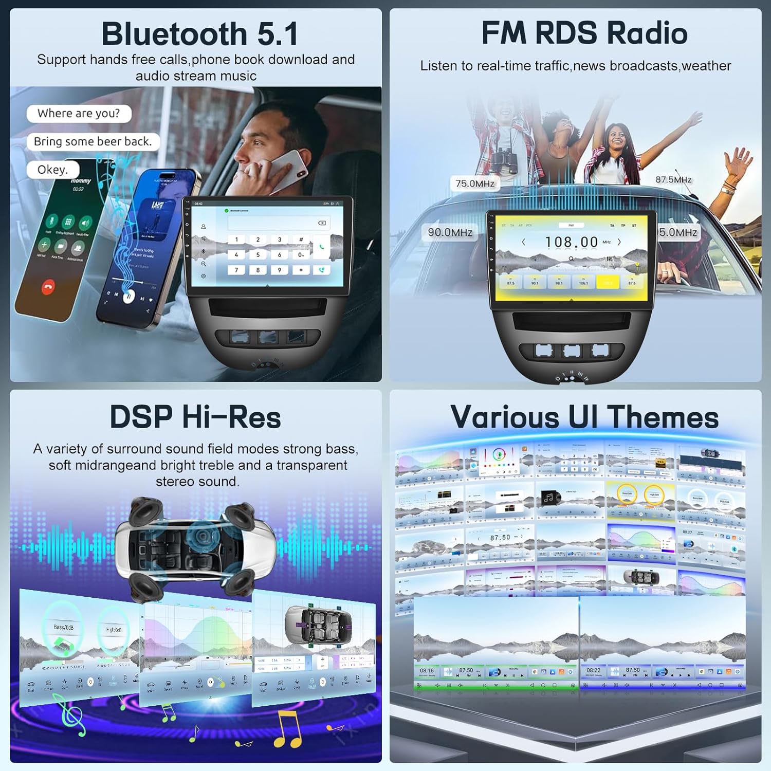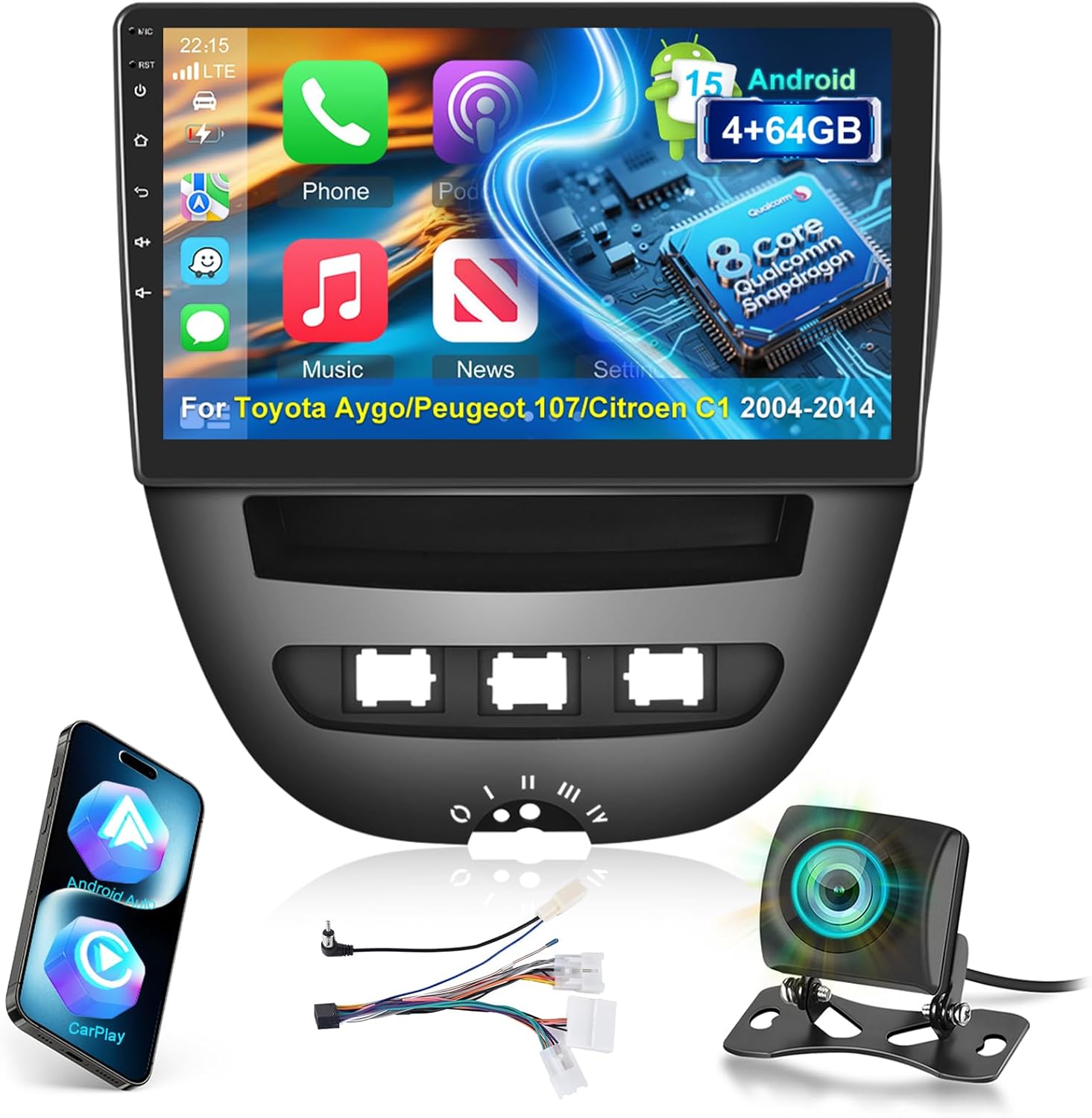 8-ядрено 4G+64G Qualcomm автомобилно радио за Toyota Aygo/Peugeot 107/Citroen C1 2004-2014 с безжичен Carplay Android, Android 15 10.1-инчово сензорно радио с WiFi, GPS, Bluetooth 5.1, FM/RDS, DSP