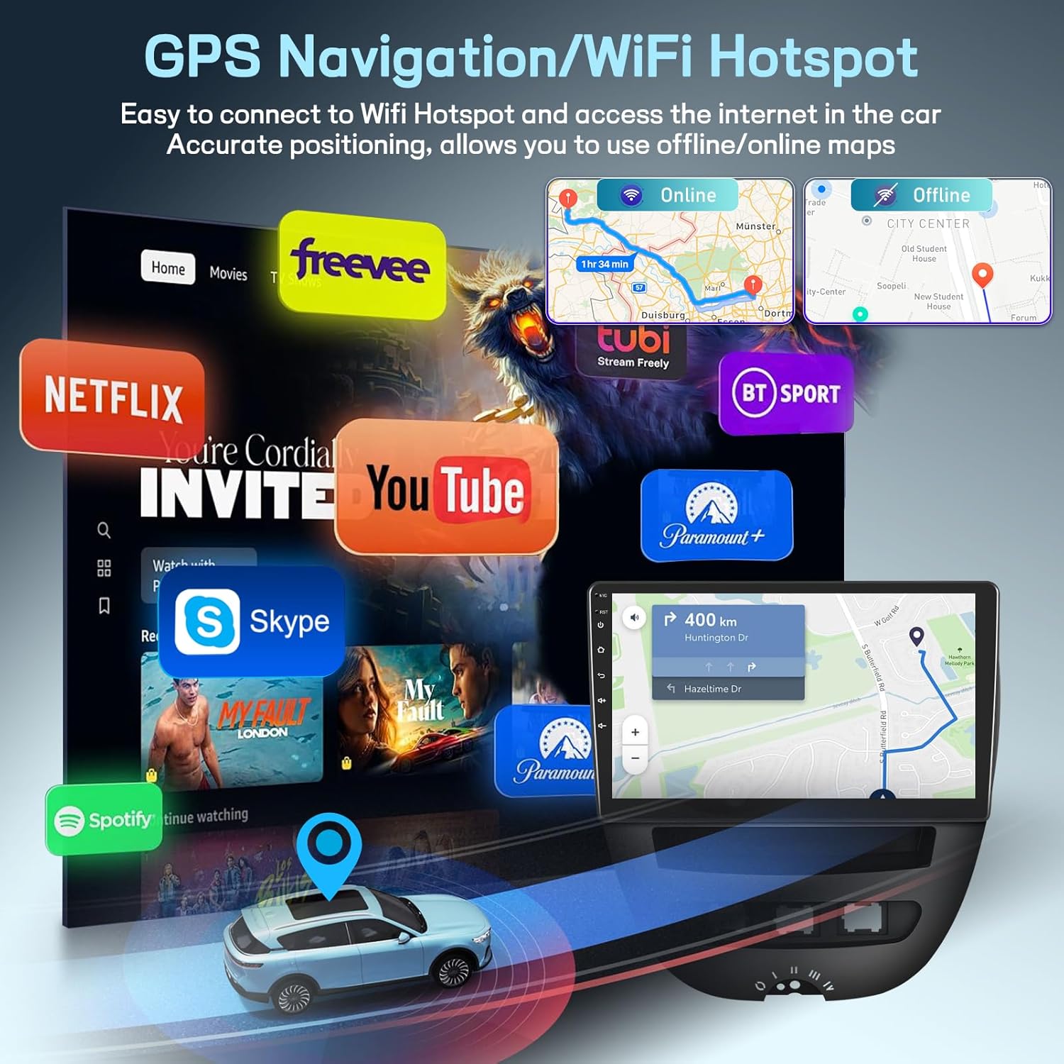 • GPS навигация офлайн/онлайн и WiFi hotspot: автомобилното радио Toyota Aygo carplay е оборудвано с GPS навигация. Можете да използвате онлайн карти и да изтегляте офлайн карти. Благодарение на WiFi можете да се възползвате максимално от App Store и да използвате различни приложения като онлайн карти, YouTube, TikTok, Spotify и други.