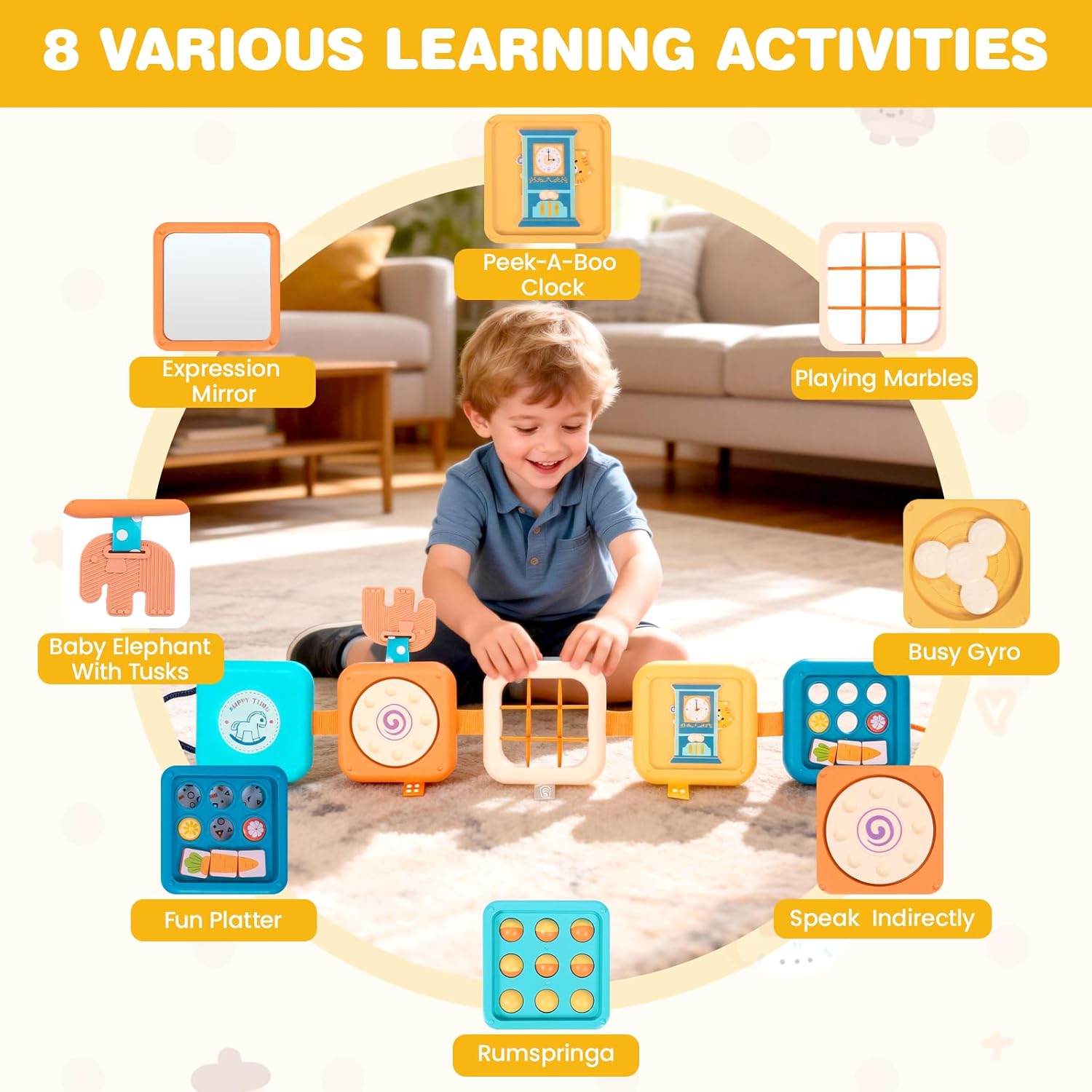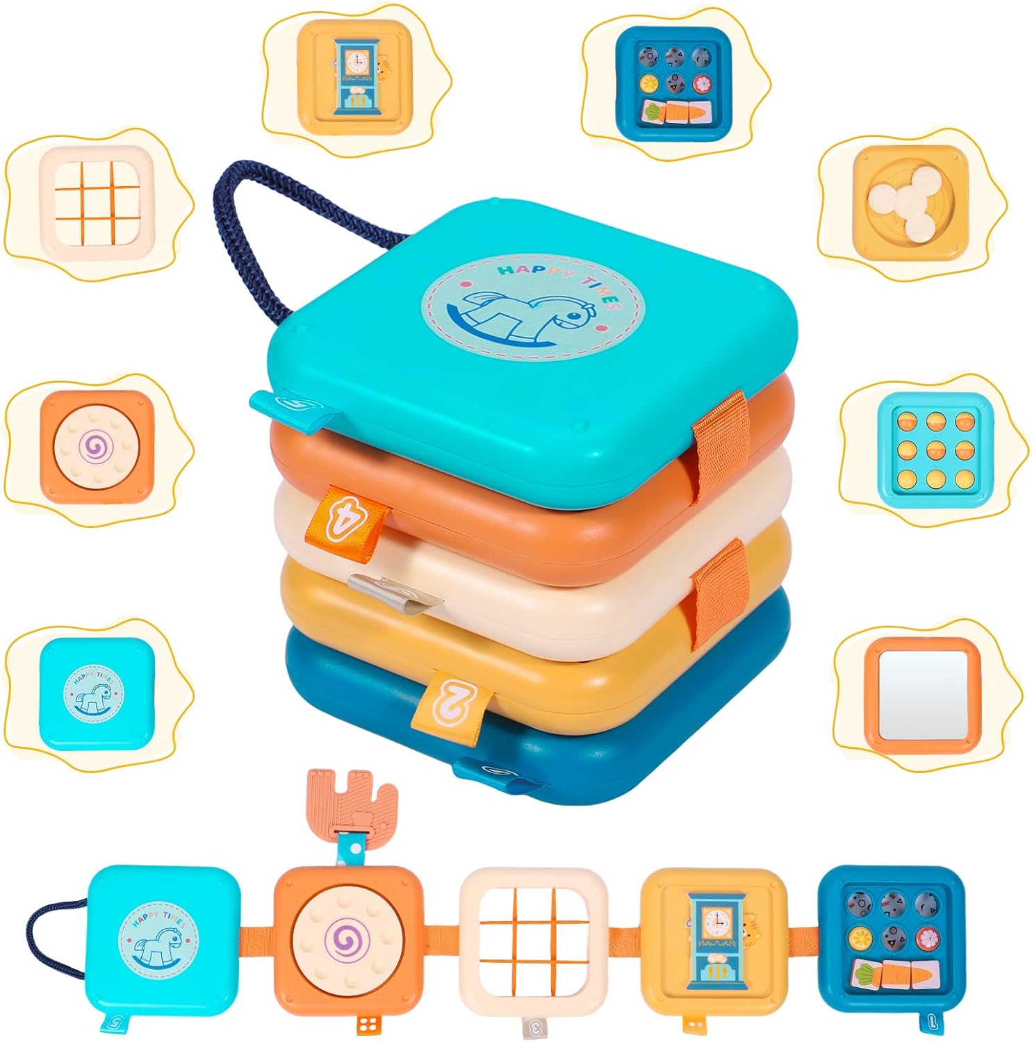 • 【8-в-1 учебен куб】 Този куб за дейности Монтесори съчетава осем функции с пъзел с моркови, въртящи се зъбни колела, еластична нишка, огледало за игра, игра с часовник и въртящо се колело. Всяко упражнение насърчава практическото изследване и ранното детско развитие.