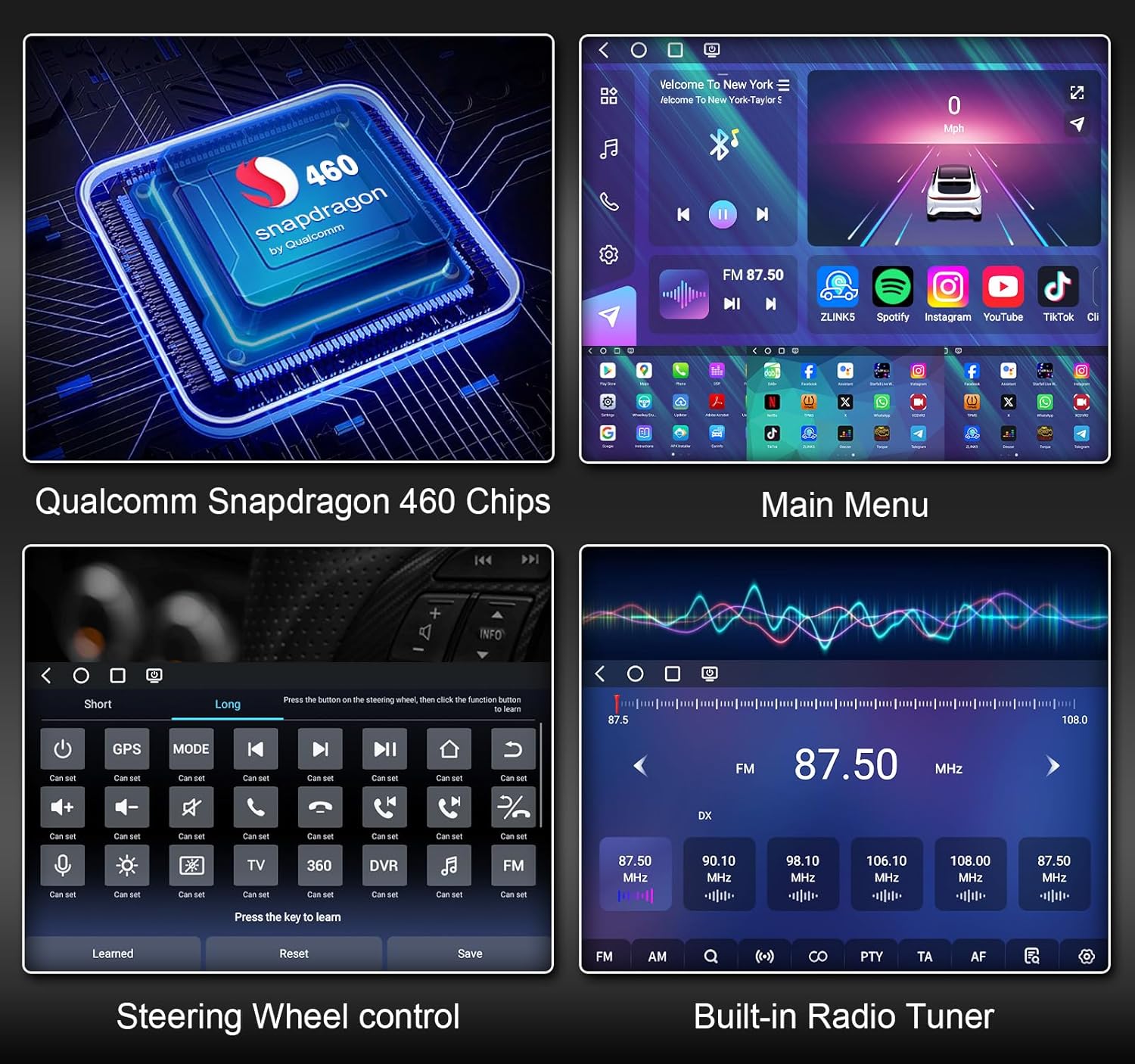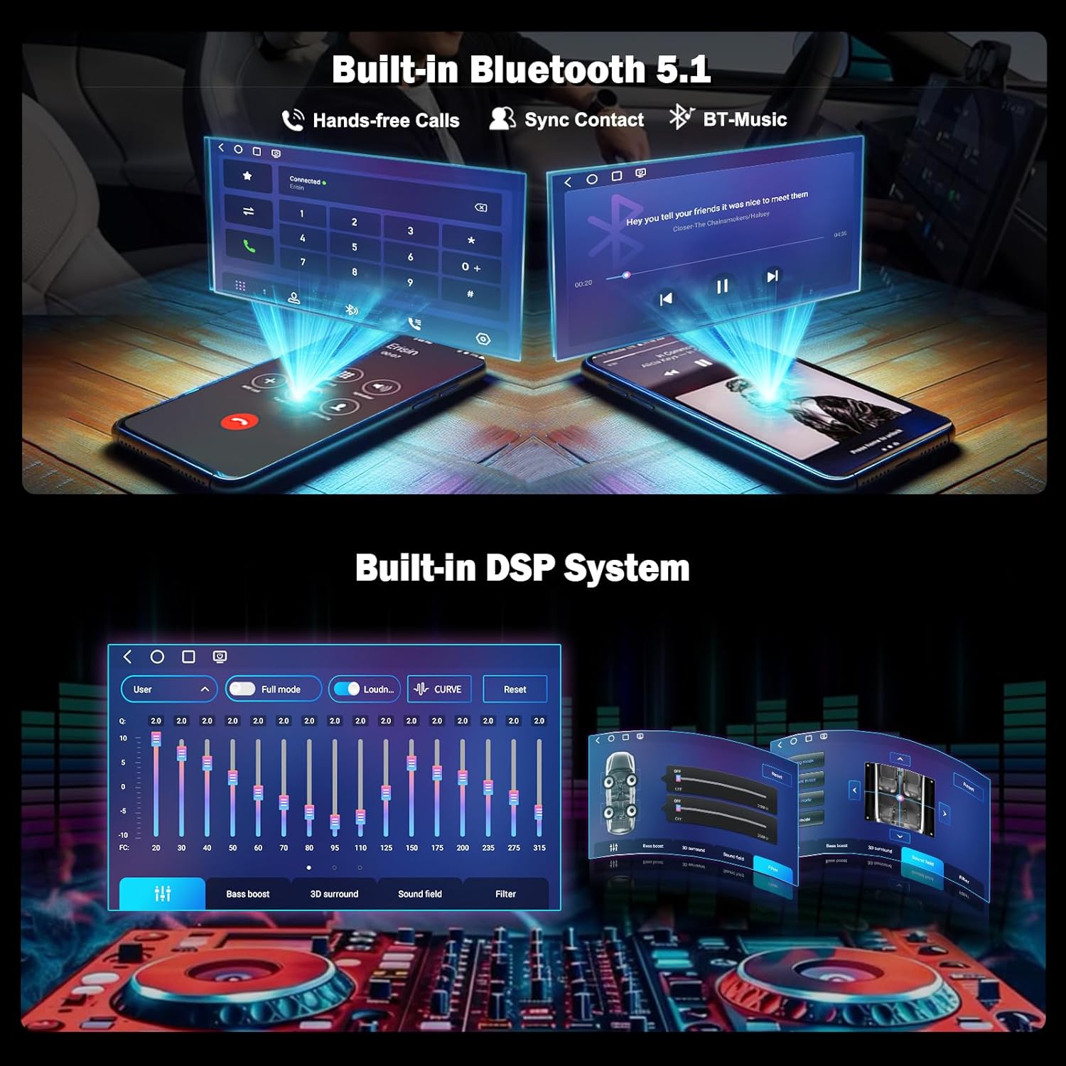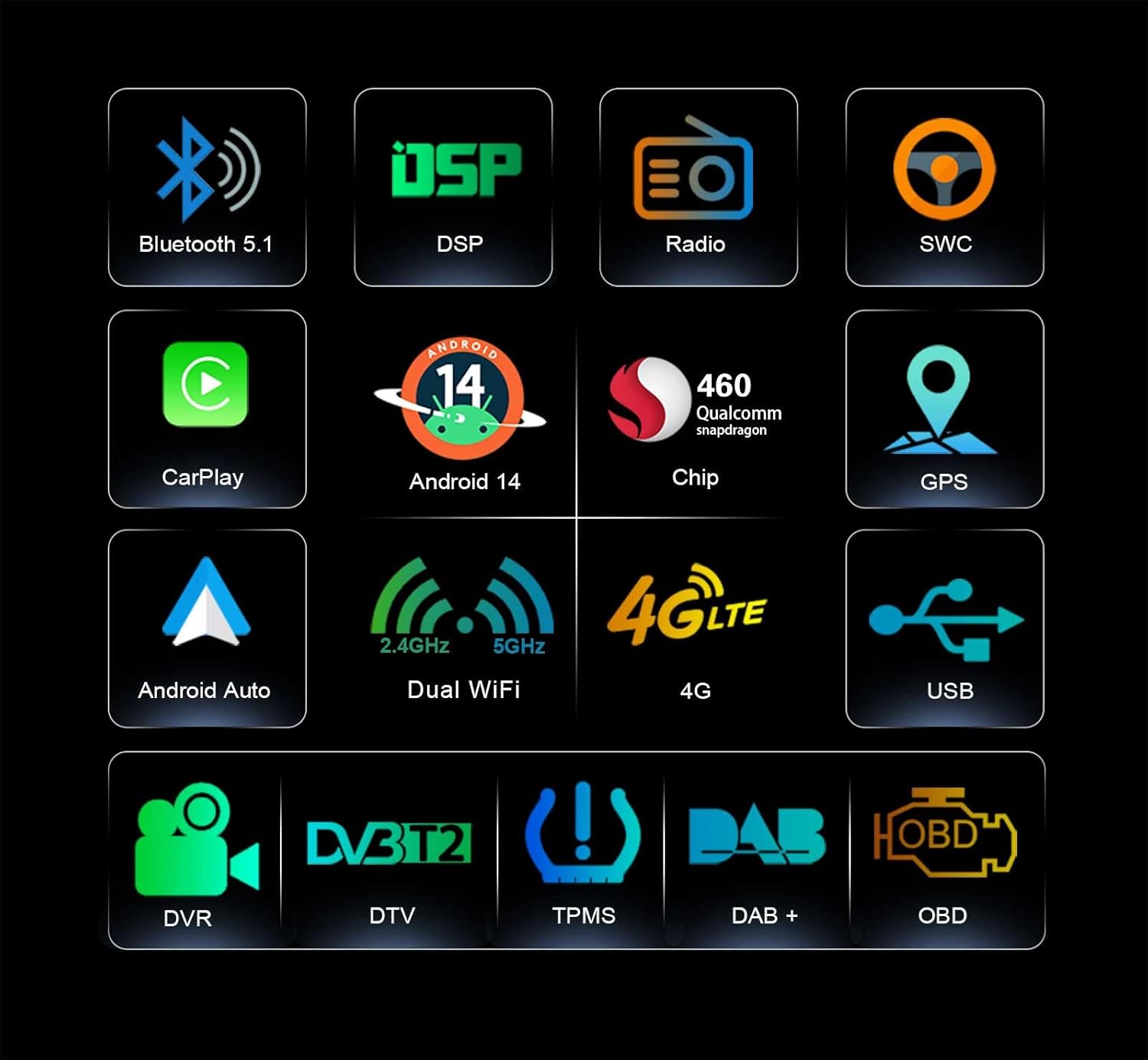 Android 14.0 OS, Qualcomm Snapdragon 460 chips, 11nm technology, eight-core processor, 8GB RAM & 128GB ROM, 3 USB up to 3 x 256GB extended memory. Optimised CANbus decoding, maintains OEM function. Integrated DSP (BU32107) amplifier system with 48-band EQ can get the perfect perfect sosobring it into your car. Built-in wireless and wired Apple CarPlay and Android car. No need to use another adapter. The carplay function can be realized by connecting the mobile phone to Bluetooth and the Android car function can be realized by connecting the mobile phone with USB data cable or Bluetooth. Built-in Bluetooth 5.1 module, hands-free calls, Bluetooth music, phone book, display of the last call. Built-in GPS module that supports offline GPS navigation and prepares GPS function. Built-in dual band WiFi for Internet, supports 2.4-GHz and 5 GHz WiFi band. Built-in 4G module for the Internet, supports 99% of network operators worldwide, supports micro SIM card. Built-in Android multimedia player, it can play music/video/photo from internal memory or external USB stick. Built-in USB, TF, radio, RDS, clock, calendar, calculator, chrome, Adobe reader. Supports DAB+, DVB-T/T2, TP. MS, OBD2 DVR, camera, AVIN etc. advanced functions. Supports steering wheel remote control, driver can operate the product easier and safer. Intelligent UI design, you can change wallpaper, warm or cool colour and LED button lighting. Supports split screen view, you can run two apps side by side.