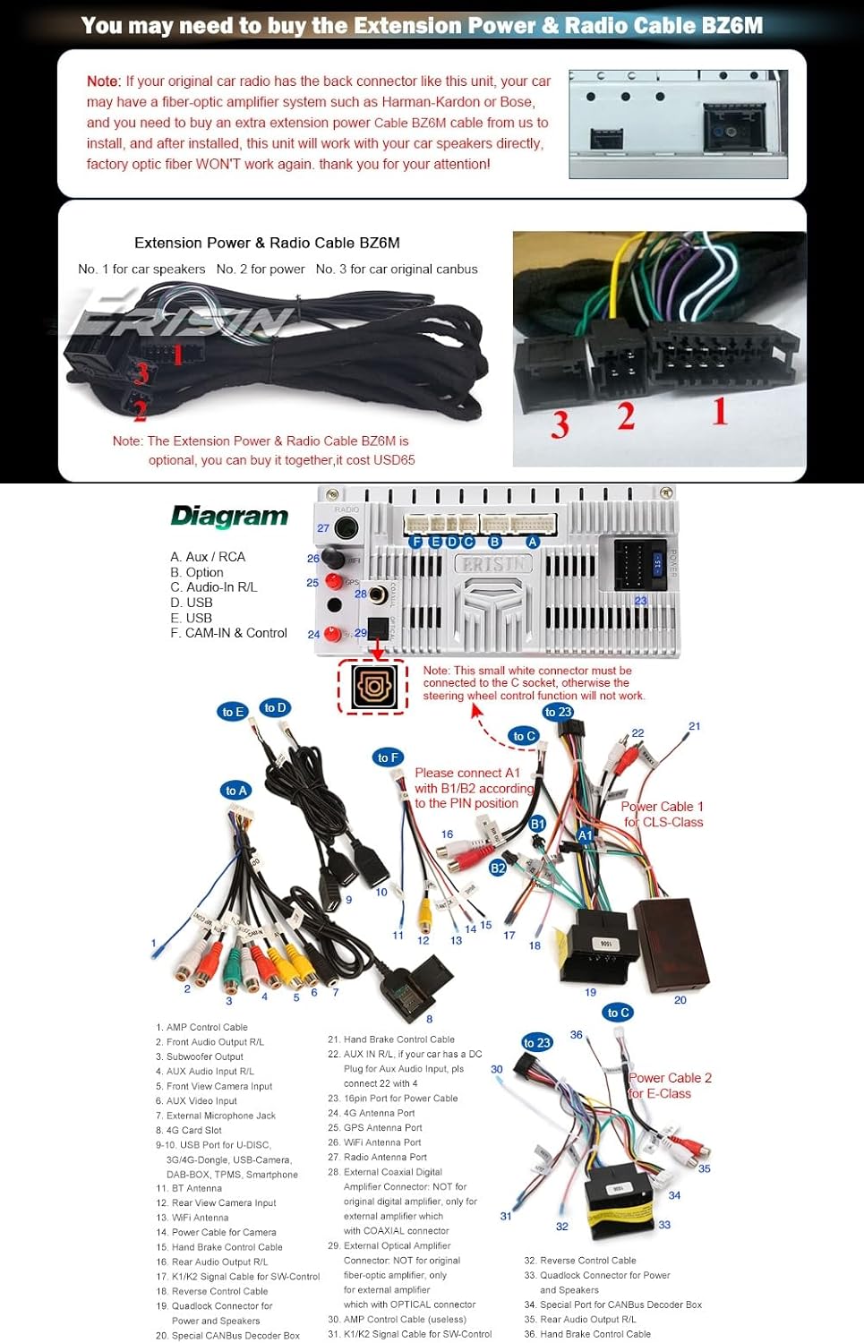 Please read the panel dimensions of 266 mm (top width) x 120 mm (high) x 238 mm (base width) and compare it with your dashboard or original media player before bidden to avoid errors. If your car has a fibre optic amplifier/sound system such as Harman-Kardon or , you need extension power and radio cable BZ6M B096FQC5J6) for installation, after connection, the sound from the device is output directly via the speakers of the car, and your fibre optic amplifier will not work. The original CD changer will no longer work after installation.