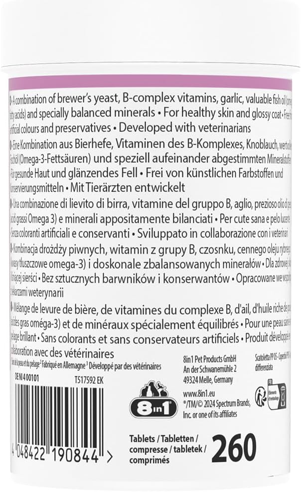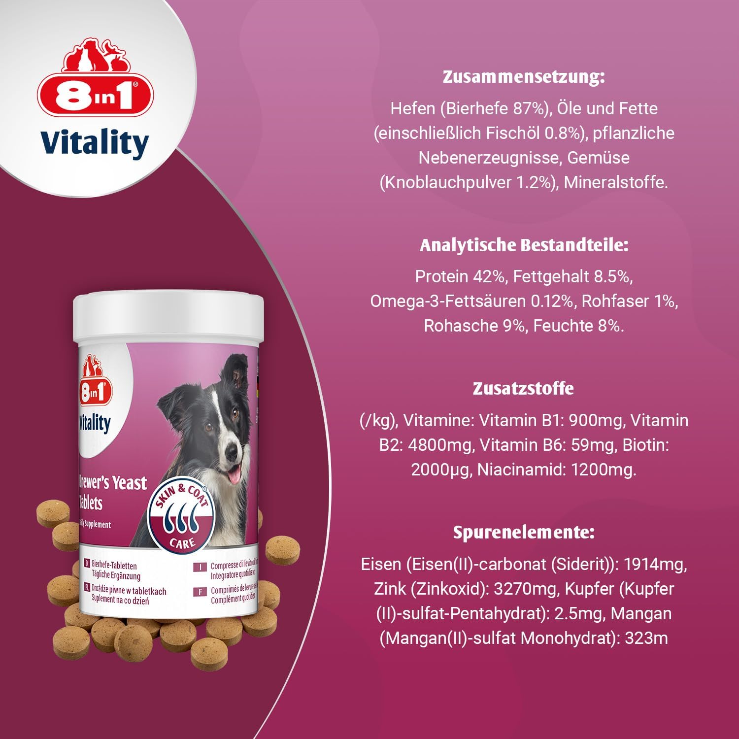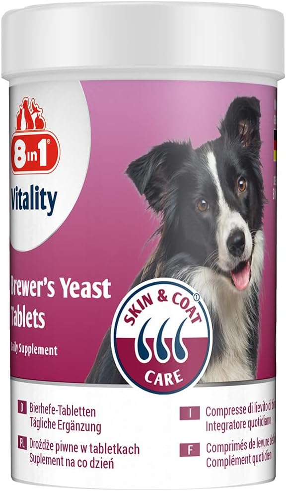 Таблетките 8в1 бирена мая са перфектни като ежедневна хранителна добавка, поддържаща здрава кожа и лъскава козина. Недостигът на хранителни вещества може да повлияе негативно на кожата и козината на вашето куче. Ето защо нашата формула, разработена в сътрудничество с ветеринарни лекари, съдържа висок процент витамини от група B, включително B1, B2 и B6, както и биотин, за да поддържа кожата здрава. Ценното рибено масло обогатява нашата добавка с есенциални омега-3 мастни киселини. Таблетките бирена мая също така осигуряват на вашето куче специално балансирана смес от пет минерала, включително цинк и желязо. Комбинацията от бирена мая, витамини от група B, чесън, рибено масло и специално балансирана минерална смес гарантира, че вашето куче получава правилните хранителни вещества за здрава кожа и здрава козина. Таблетките 8в1 бирена мая не съдържат изкуствени оцветители или консерванти. Тази хранителна добавка е подходяща за всички кучета и е произведена в Германия.