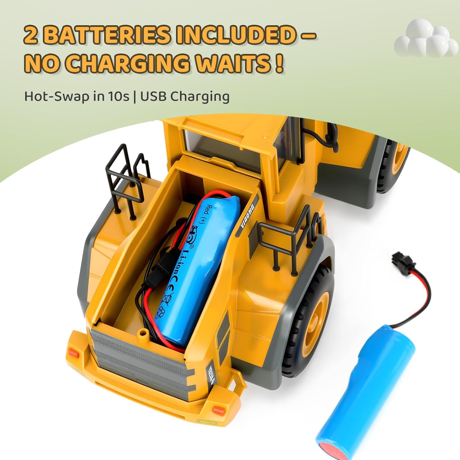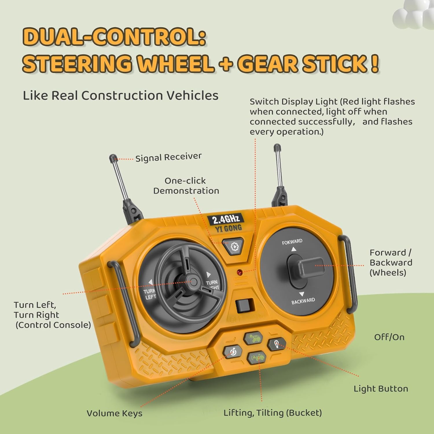 Инструкции за употреба: 1. Извадете багера от опаковката. 2. Почистете всички подвижни части с топла сапунена вода. 3. Свържете дистанционното управление 2.4 GHz и USB кабела. 4. Поставете батериите и ги заредете напълно. 5. Синхронизирайте багера и дистанционното управление. 6. Поставете багера върху равна повърхност. 7. Активирайте дистанционното управление и работете с багера. 8. След употреба изключете багера и дистанционното управление и заредете батериите, ако е необходимо.