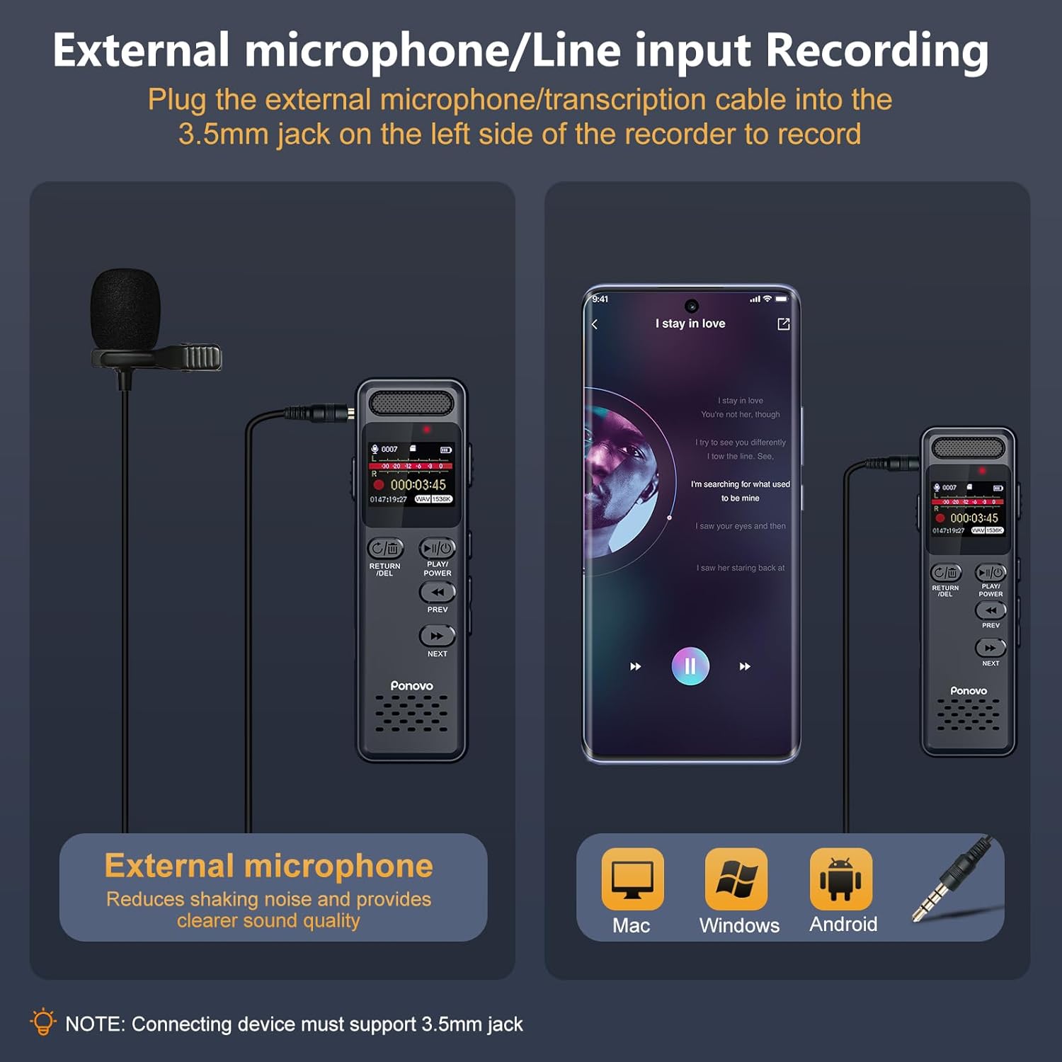 • 96 GB памет и 6000 часа капацитет за запис: Ponovo е специализирана в разработването на устройства за диктовки, за да предложи надеждни устройства за запис. Това подобрено устройство предлага 96 GB пространство за съхранение (32 GB вътрешна памет + 64 GB карта с памет) и може да съхранява до 6000 часа аудио при 32 Kbps. Проектирано за дългосрочен запис, то осигурява пълния запис на всяка лекция, среща и интервю, без постоянно изтриване на файлове или притеснение за твърде малко място за съхранение.