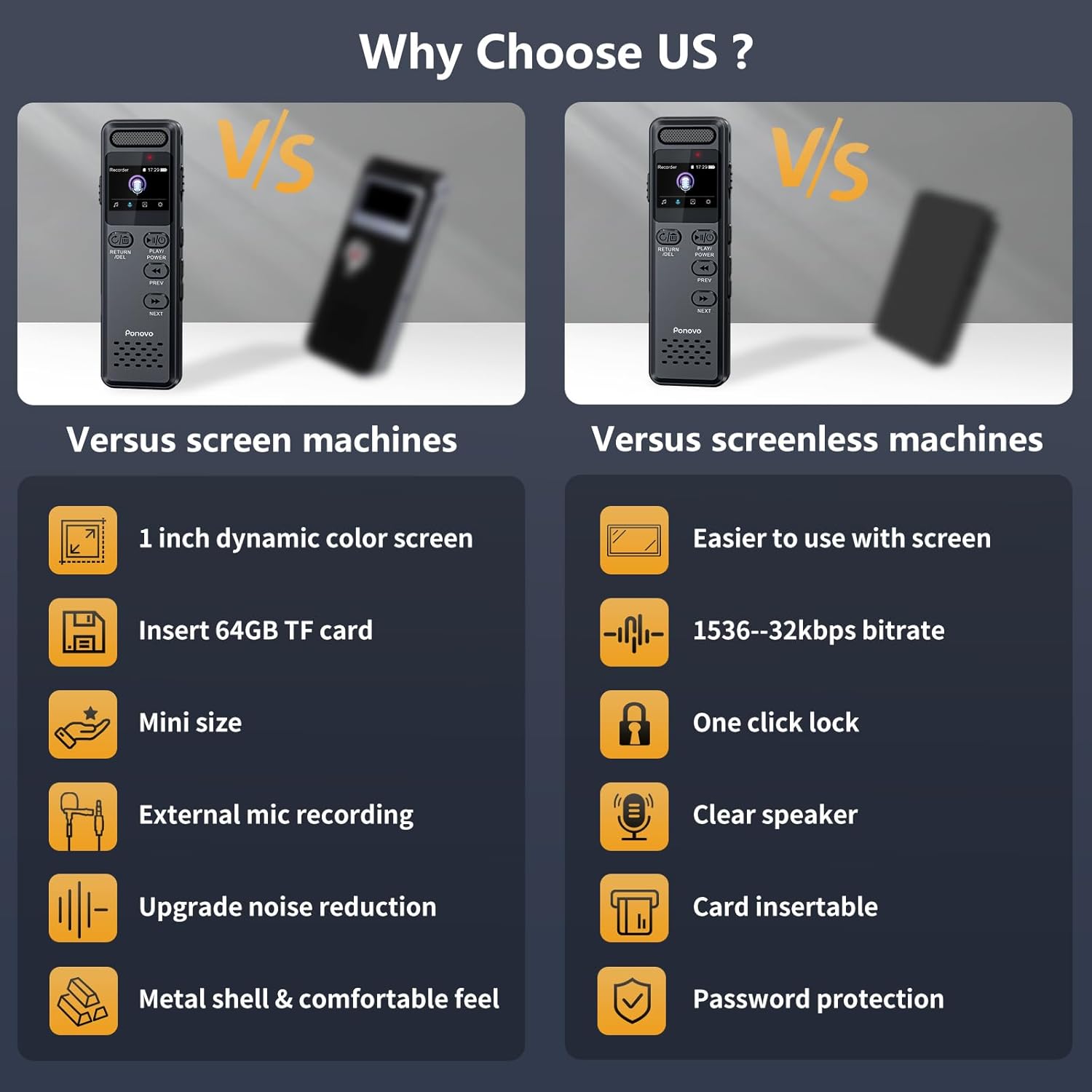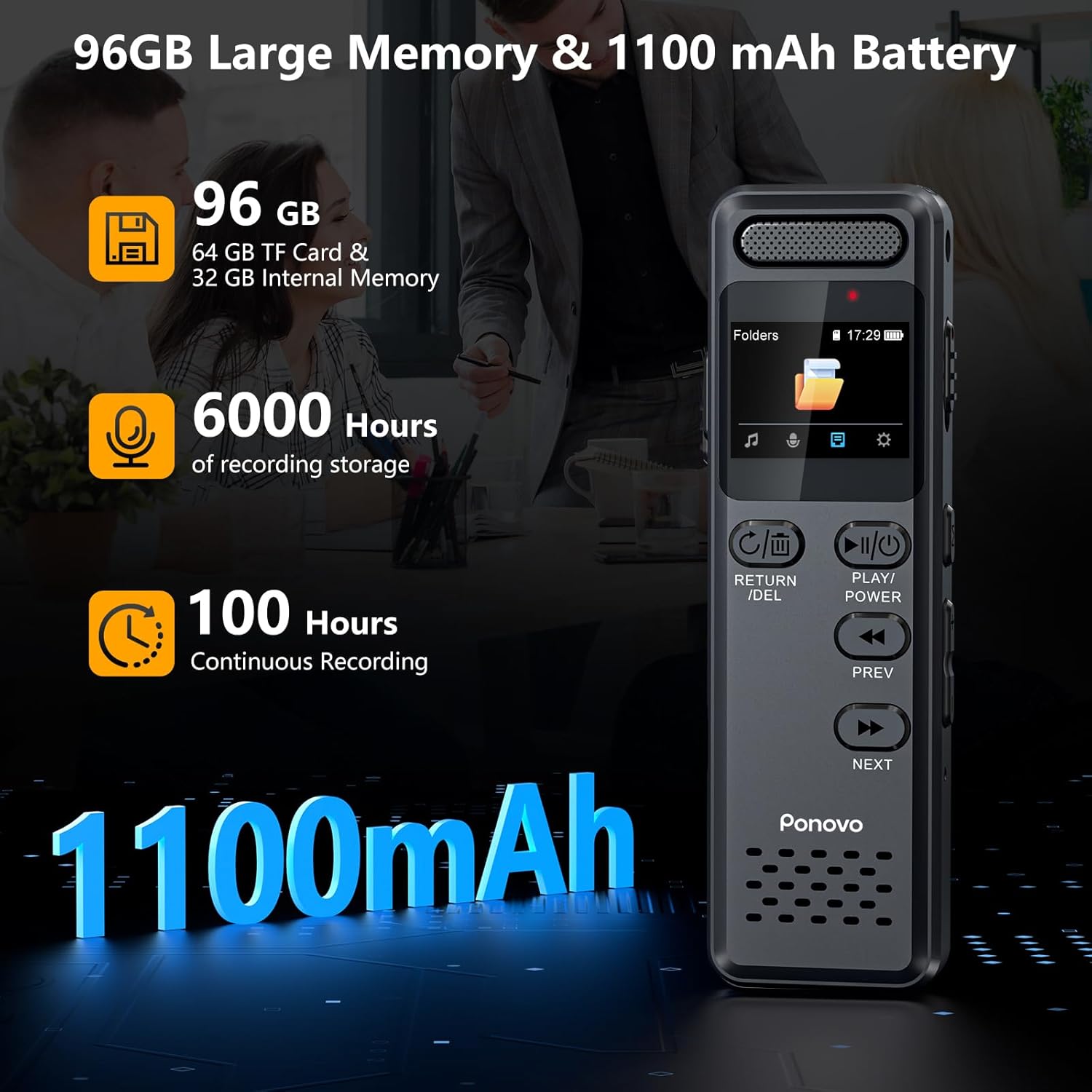 96GB цифров гласов рекордер с разпознаване на глас, записващо устройство Ponovo, 100 часа непрекъснат запис, 1536kbps HD гласов рекордер с микрофон, 1100 mAh мини диктофон за интервюта и срещи