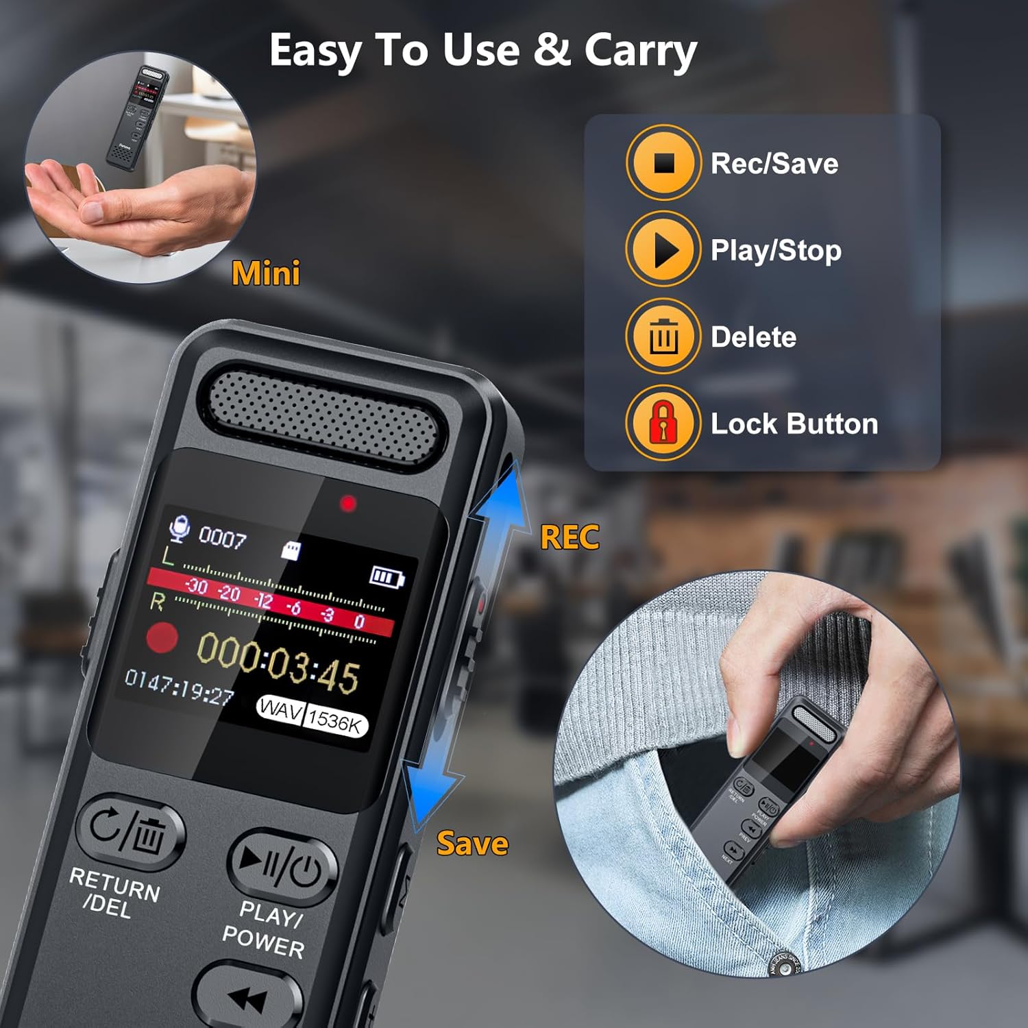 • Запис с едно докосване и функция за сигурно заключване: нашият гласов рекордер е разработен за лесна работа. Просто плъзнете превключвателя REC, за да започнете записа веднага, дори когато устройството е изключено. Ексклузивната функция за заключване предотвратява случайни докосвания и осигурява непрекъснати сесии на запис. Ако цените надеждността и лекотата на използване, това устройство за запис с гласово активиране е идеалното устройство за вашите нужди.