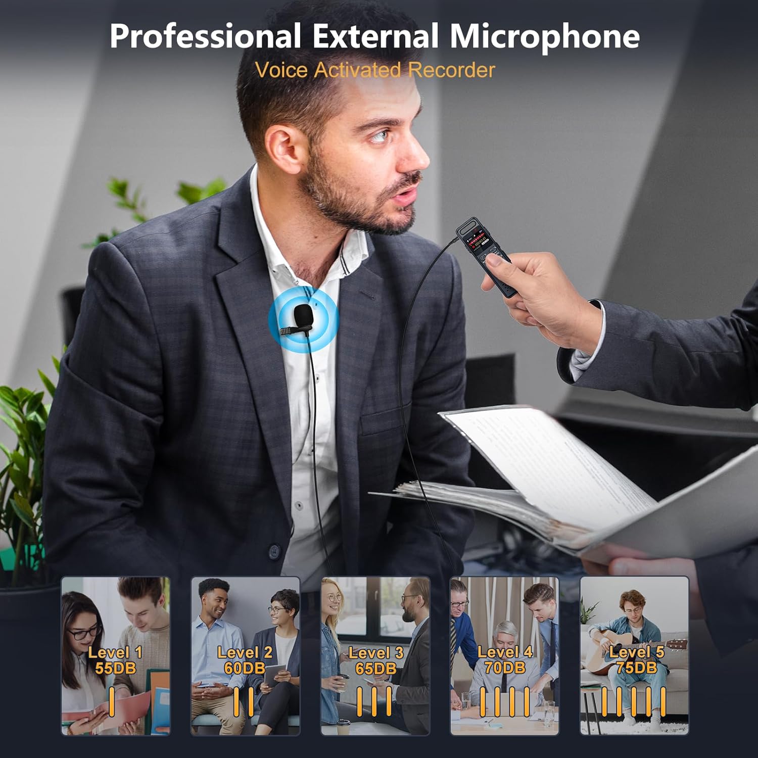• Професионален външен микрофон и шумопотискане: външният кабелен микрофон позволява насочено записване на звук и улавя целевия глас (напр. от партньори в интервюта или говорители). Подходящ е за сценарии, които изискват HD запис, като например интервюта с журналисти или бизнес срещи. Подобреният чип за намаляване на шума 2159 на диктофона може ефективно да филтрира ненужния фонов шум и да осигурява ясни записи до 1536 Kbps.