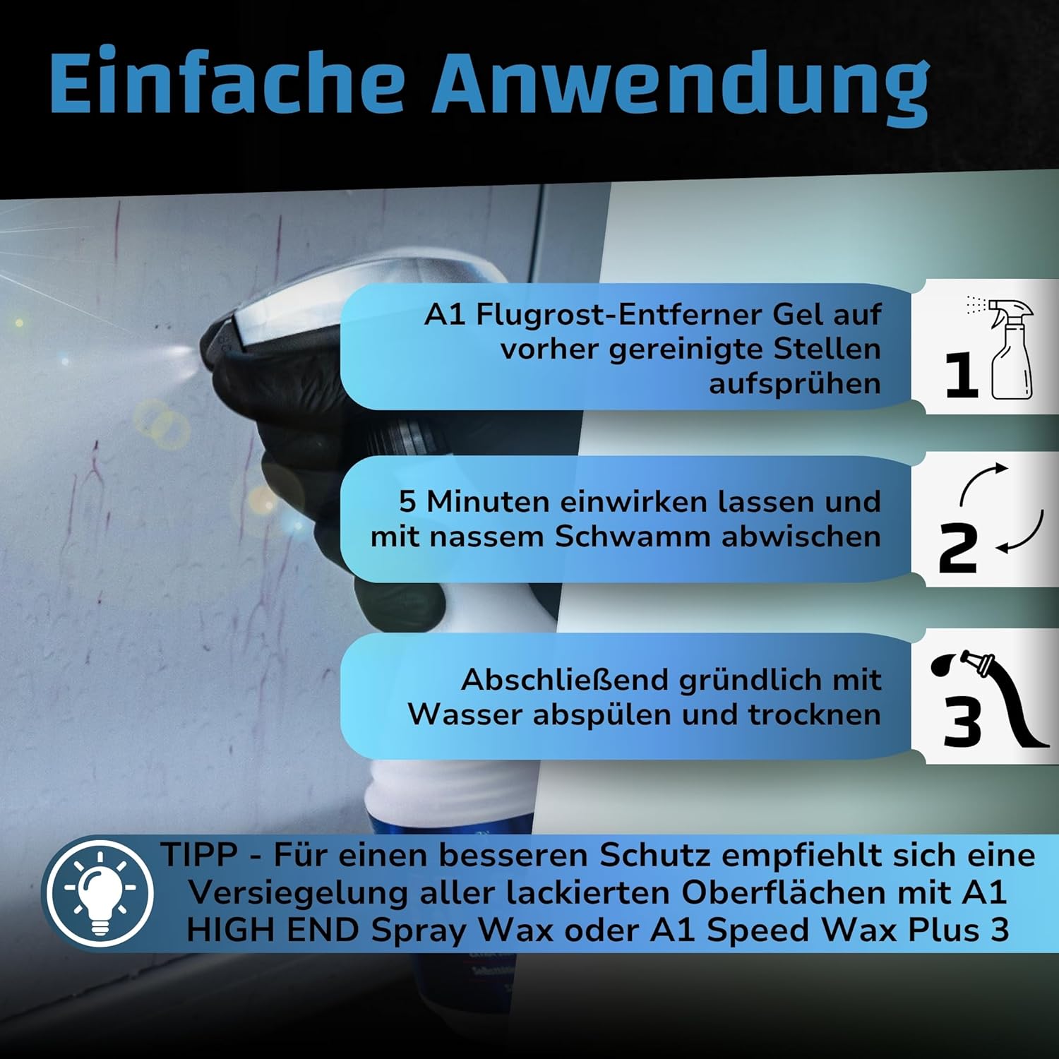 • Силна почистваща сила – с гела за премахване на ръжда A1 от Dr. Wack, автомобилът се освобождава бързо и автоматично от ръжда, следи от корозия и прах от индуктор.