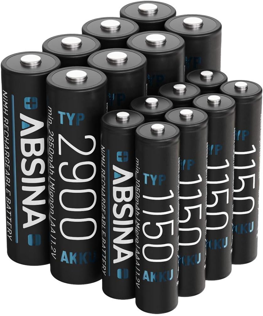 ABSINA 8 x AA Mignon 2900 и 8 x AAA Micro 1150 батерии, NiMH акумулаторни батерии с 1.2 V, батерии за устройства с висока консумация на енергия, батерии идеални за флаш, Wii и Xbox контролер,