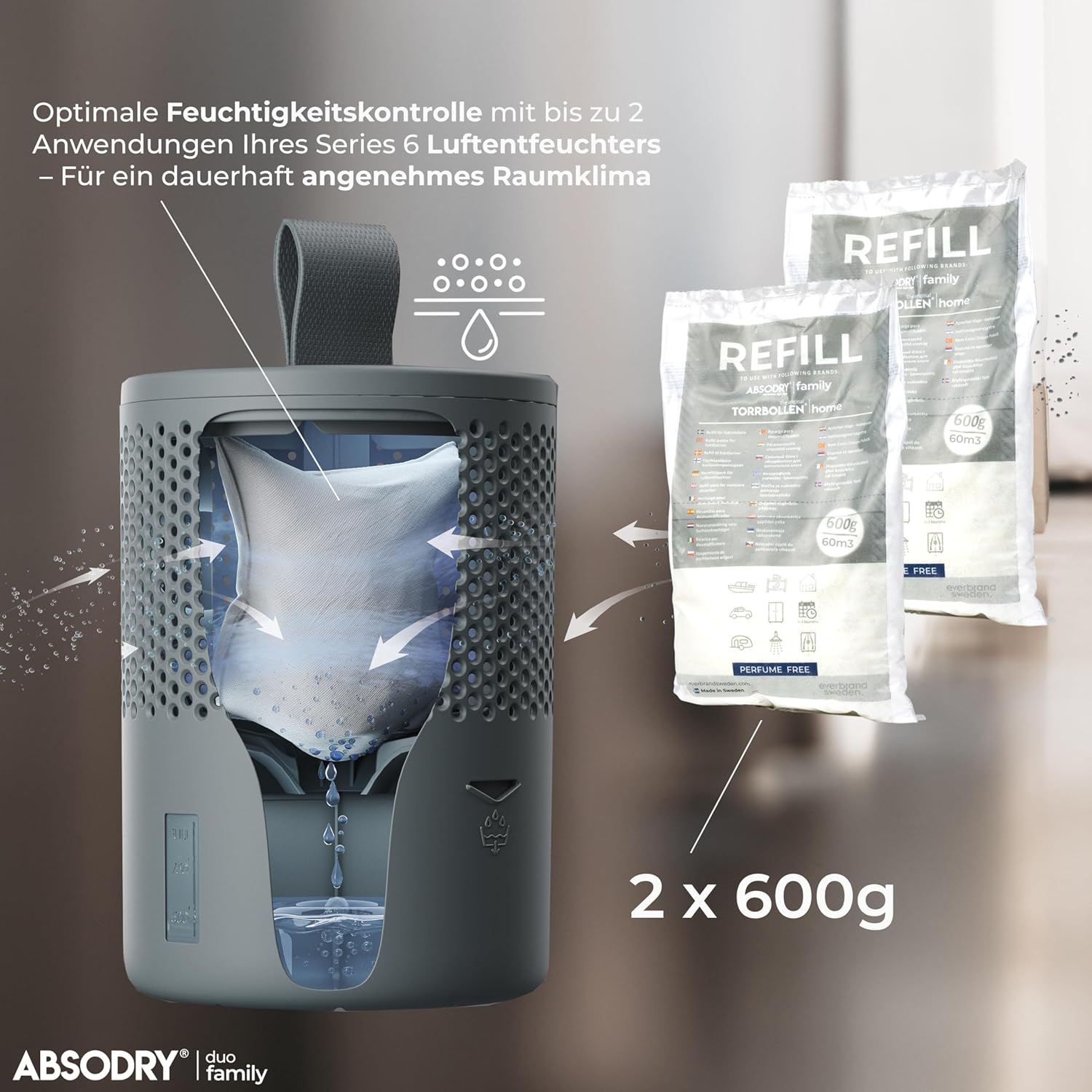 AbsoDry - Комплект за пълнене на влагоабсорбатор 2 x 600 г - Съвместим с AbsoDry - Предотвратява миризмата и задържа влагата - Торбичка с влагоабсорбатор с гранули за влагоабсорбатор - Комплект за пълнене на влагоабсорбатор