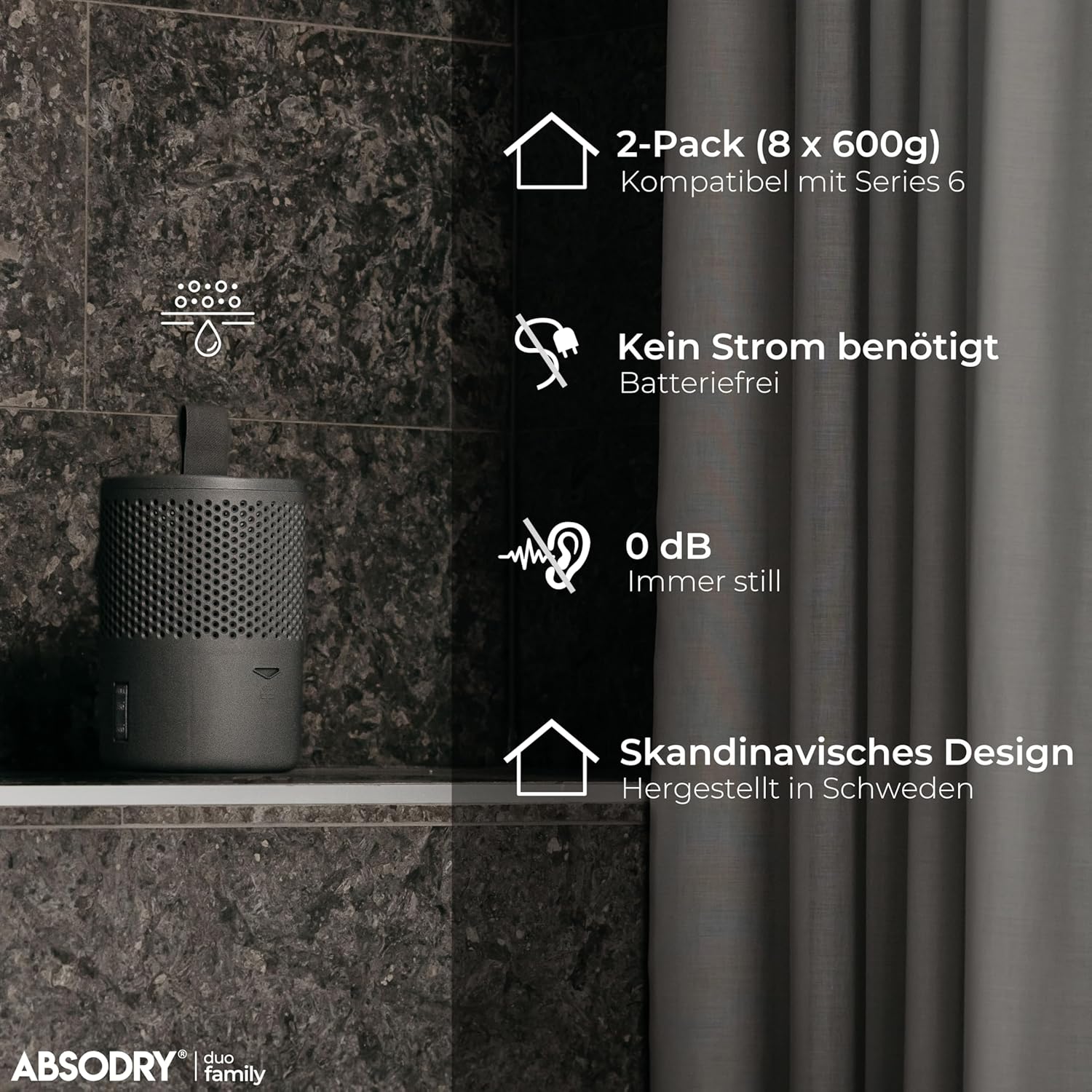 • Универсално съвместим: Комплектът за пълнене на влагоабсорбатор Absodry е съвместим с влагоабсорбатори Absodry с капацитет 600 г. В икономична опаковка от 2 x 600 г за до 6 месеца работа (в зависимост от влажността).