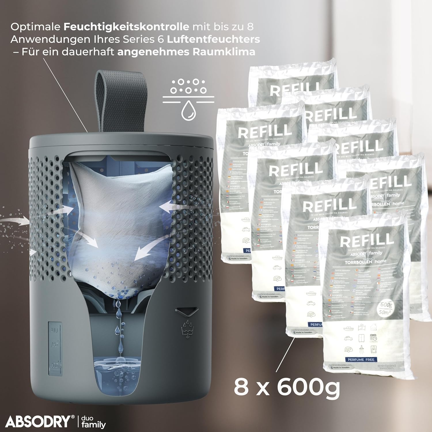AbsoDry Duo Family - Комплект за пълнене на влагоабсорбатор 8 x 600 г - Съвместим - Предотвратява миризми и задържа влагата - Торбичка с влагоабсорбатор с гранули за влагоабсорбатор - Комплект за пълнене на влагоабсорбатор