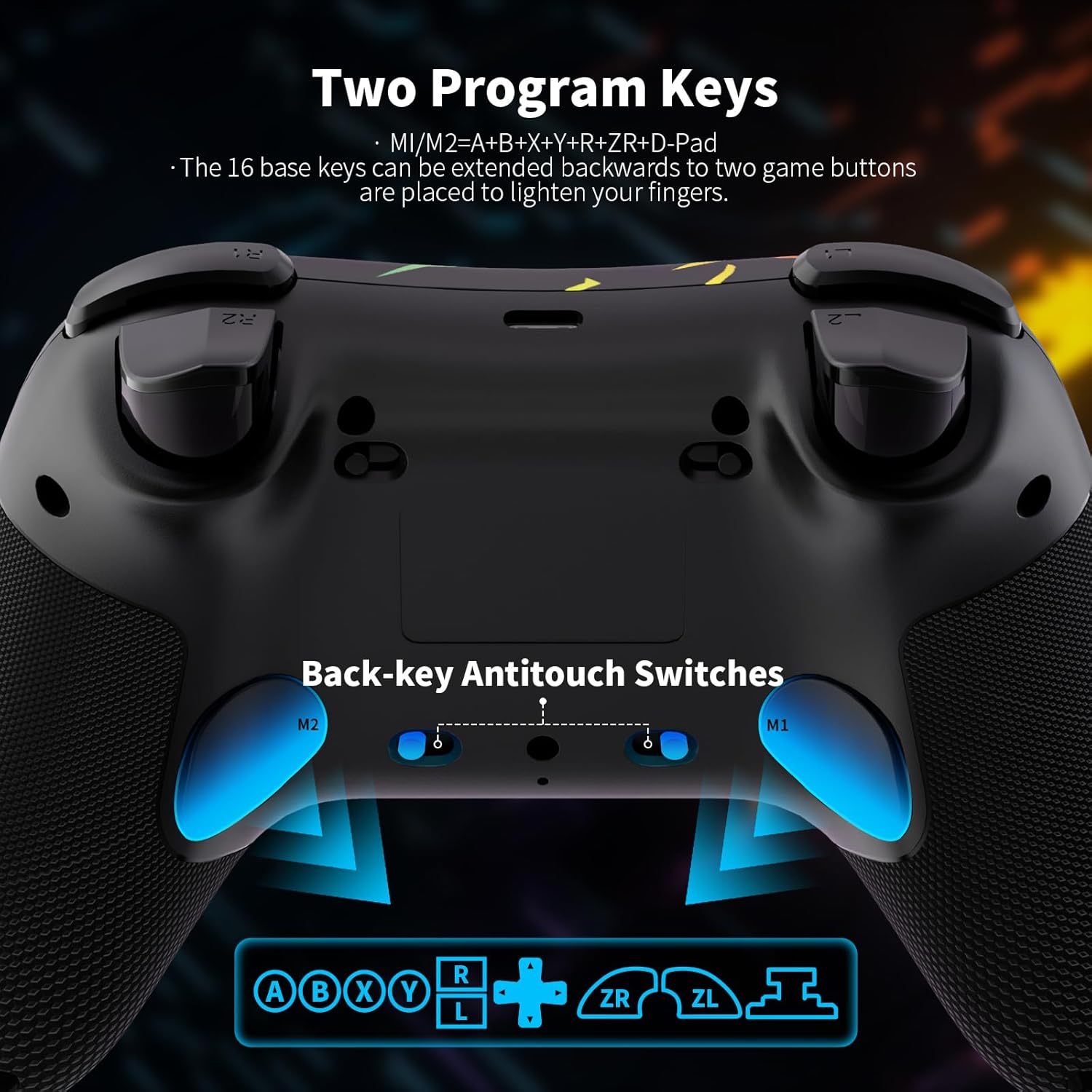 • [Програмируеми бутони за назад и бутони против докосване]: Контролерът за компютър AceGamer има два програмируеми бутона на гърба, за да опростят сложните операции с клавишите M1/M2: (M1/M2 = произволни A/B/X/Y/L/ZL/R/.) ZR/L3/R3/D подложка, до 16 бутона). Бутоните на гърба са оборудвани с превключвател против докосване, а превключвателят предотвратява случайно докосване на бутоните на гърба, така че играчите да имат свободни пръсти и да се потопят в игровото изживяване спокойно.
