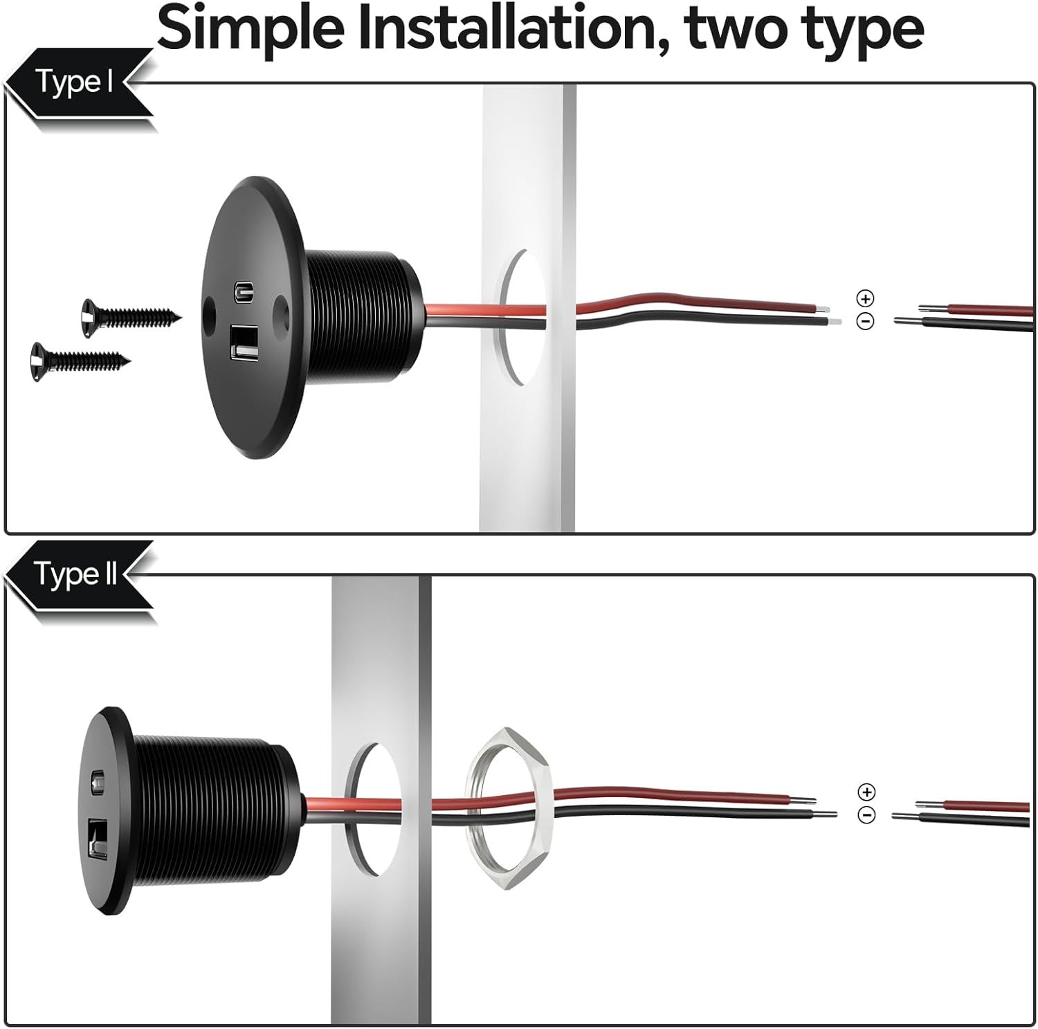• Лесен монтаж: диаметър 22 мм, предлагаме два различни вида продукти, които да отговарят на вашия дизайн. Нашият USB контакт за кемпер е проектиран за лесен монтаж. Вграденият монтаж е подходящ за плоски повърхности и изисква само 22 мм отвор за окабеляване. Предвидени са както болтове, така и гайки, за да се осигури сигурно и безпроблемно прилягане към вашия кемпер, караван или кола.