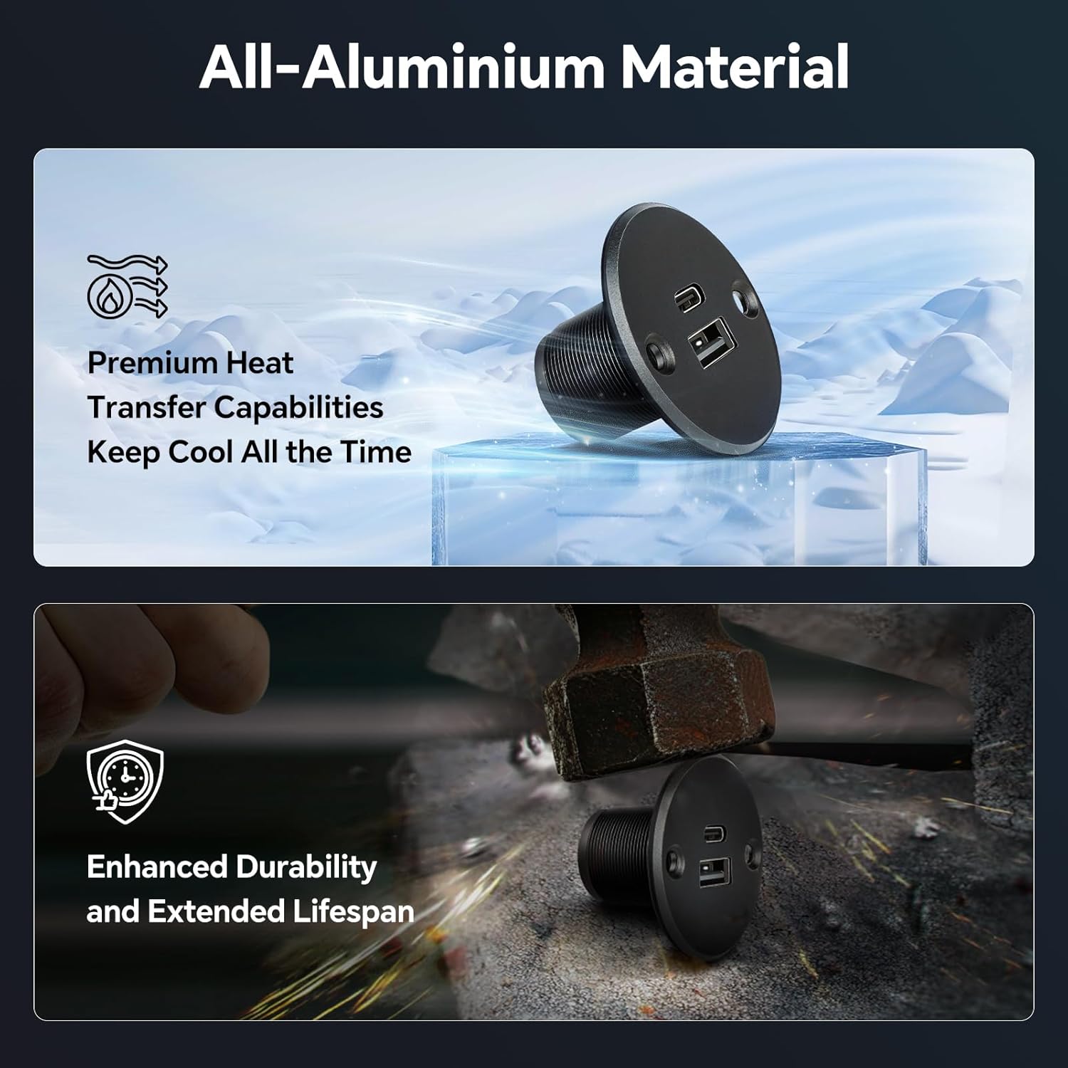 • АЛУМИНИЕВ КОРПУС И ЗАЩИТА Изработен от издръжлив алуминий, USB гнездото за кемпер Acegoo осигурява превъзходно разсейване на топлината и издръжливост в сравнение с пластмасовите алтернативи. Оборудвано с интелигентни защитни чипове и вградени предпазители, то гарантира цялостна сигурност за вашите устройства, за да можете да пътувате безгрижно.