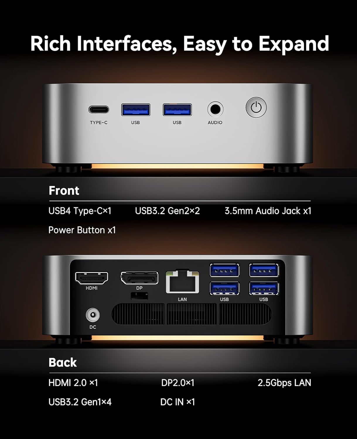 • 【Разнообразни интерфейси】Мини компютърът е оборудван с WiFi 6 и Bluetooth 5.2, а множеството портове предлагат повече възможности за избор, включително 1 x HDMI порт, 1 x Type-C порт, 1 x DP порт, 1 x 2.5 Gbps RJ45 порт, 2 x USB 3.2 Gen2 порта, 4 x USB 3.2 Gen1 порта, 1 x аудио входно/изходен жак, така че лесно да се задоволят различни външни нужди.