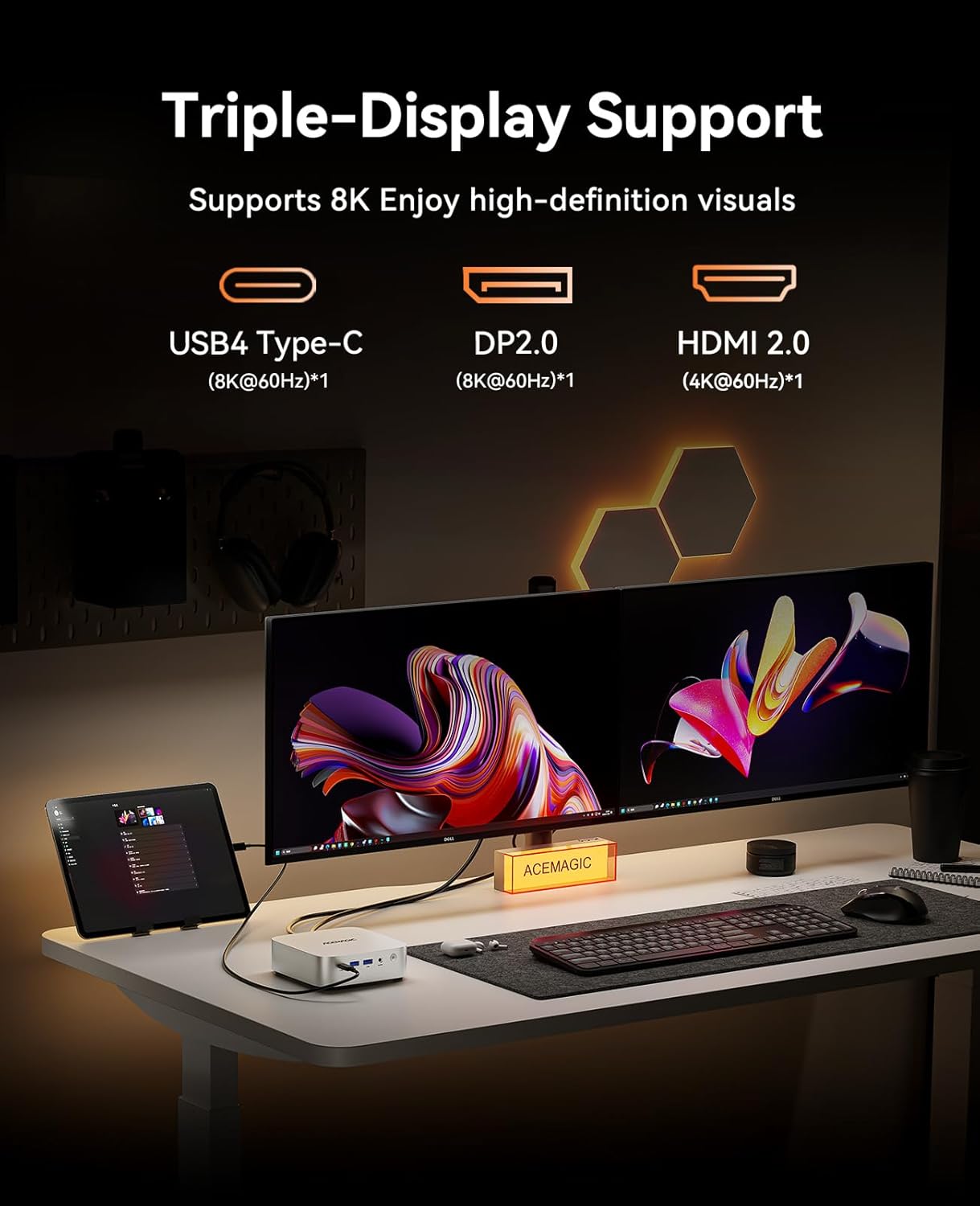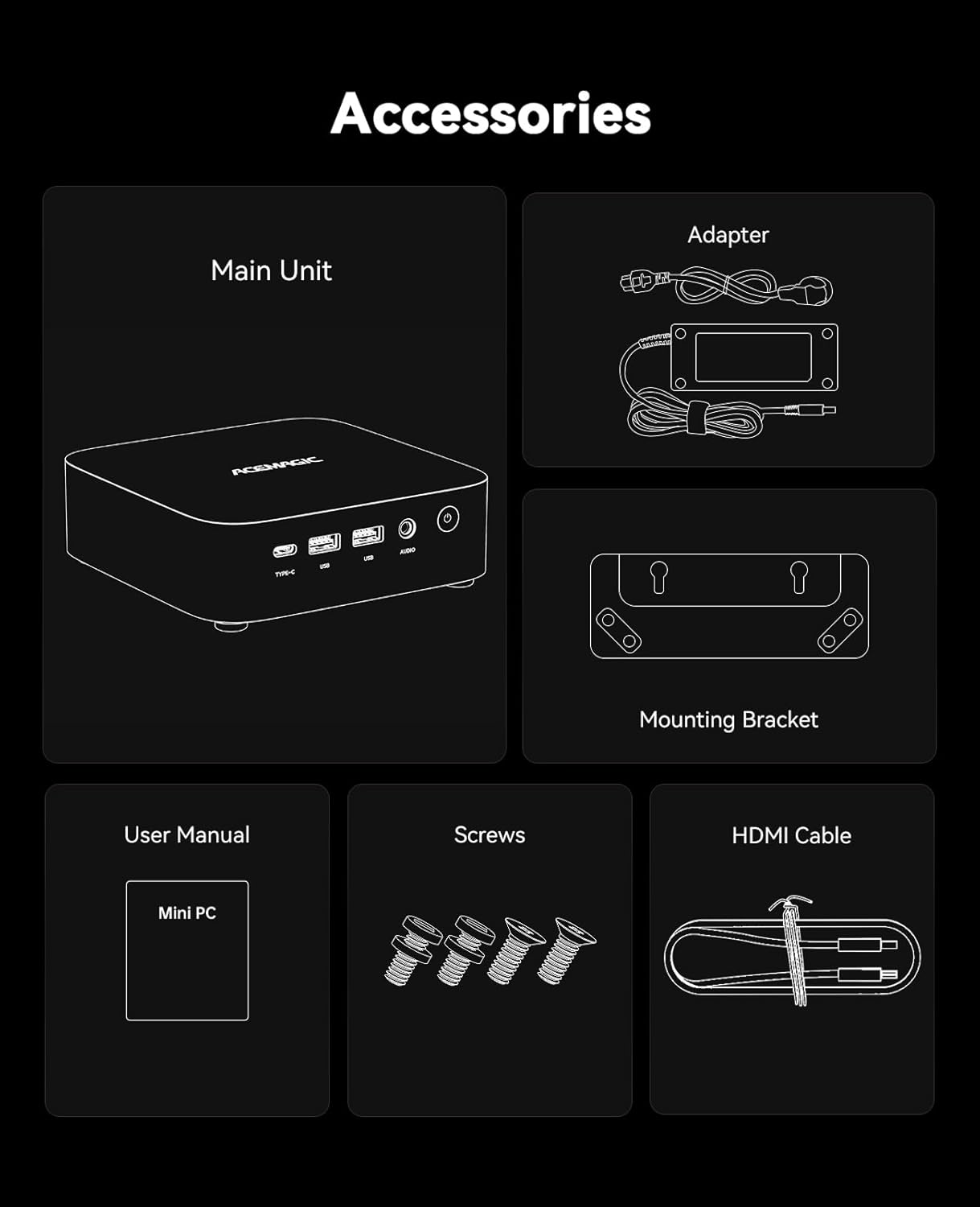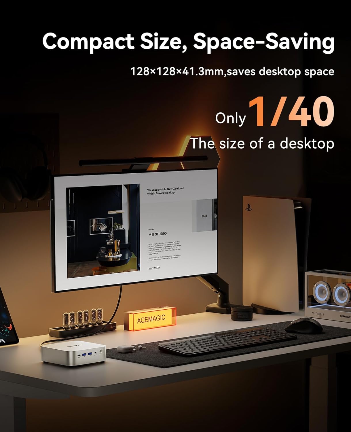 • 【Елегантен и компактен】Уморени ли сте от обемисти настолни компютри? ACEMAGIC Mini PC ще промени мнението ви! Той е с дизайн 12,8 x 12,8 x 4,1 см и компактно шаси, което заема минимално място. Също така разполага с VESA стойка и може да се монтира зад монитор, на гърба на бюро или на стена. Лесно се интегрира в различни среди, създавайки подредено и удобно работно пространство за вас.
