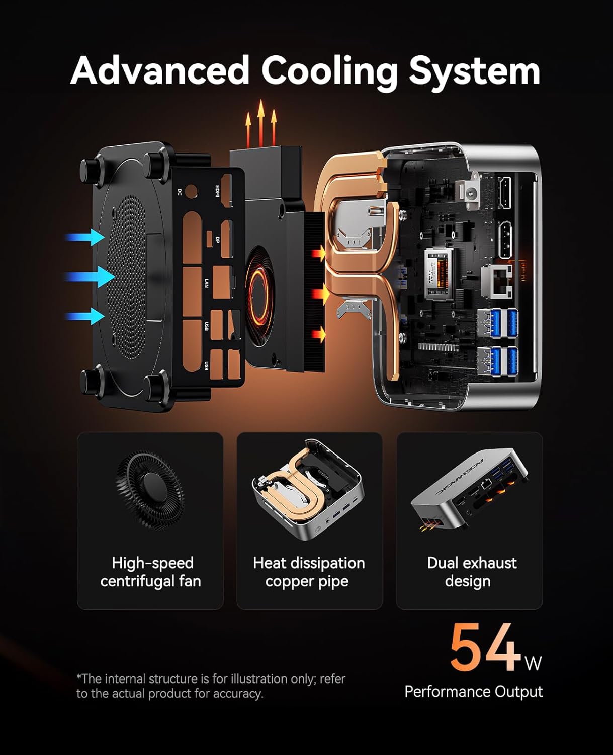 • 【Подобрена охладителна система】Мини компютърът е оптимизиран по отношение на дизайна за разсейване на топлината, използвайки професионална направляваща структура за ефективно разсейване на топлината и добра система за разсейване на топлината. Отворите в долната част са за всмукване на въздух, а отворите от лявата и дясната страна са за изпускане на въздух, осигурявайки стабилна работа дори при високи натоварвания и предотвратявайки намаляване на честотата, причинено от прегряване.