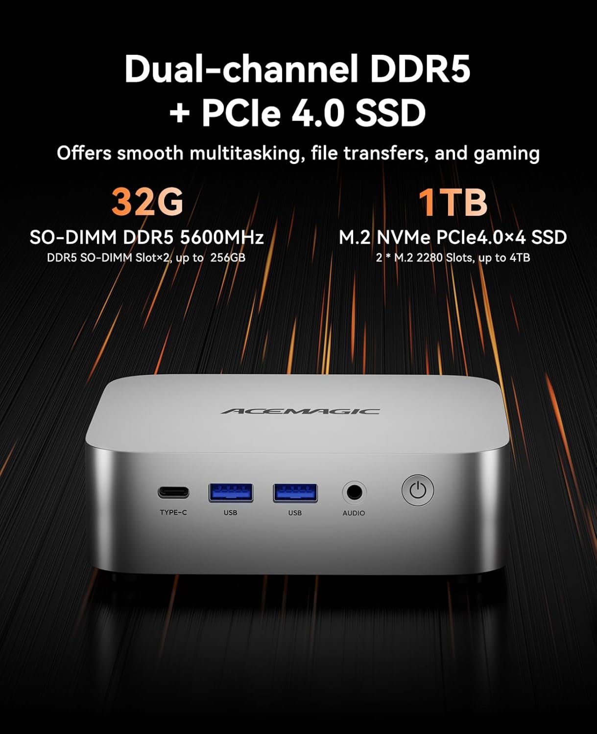 ACEMAGIC W1 Мини компютър AMD Ryzen 7 8745HS (8C/16T, до 4.9 GHz), 32GB DDR5 1TB NVMe SSD Мини компютър, AMD Radeon 780M, 8K HD Vision, WiFi 6, BT 5.2, Win 11 pro, Компактен микро настолен компютър