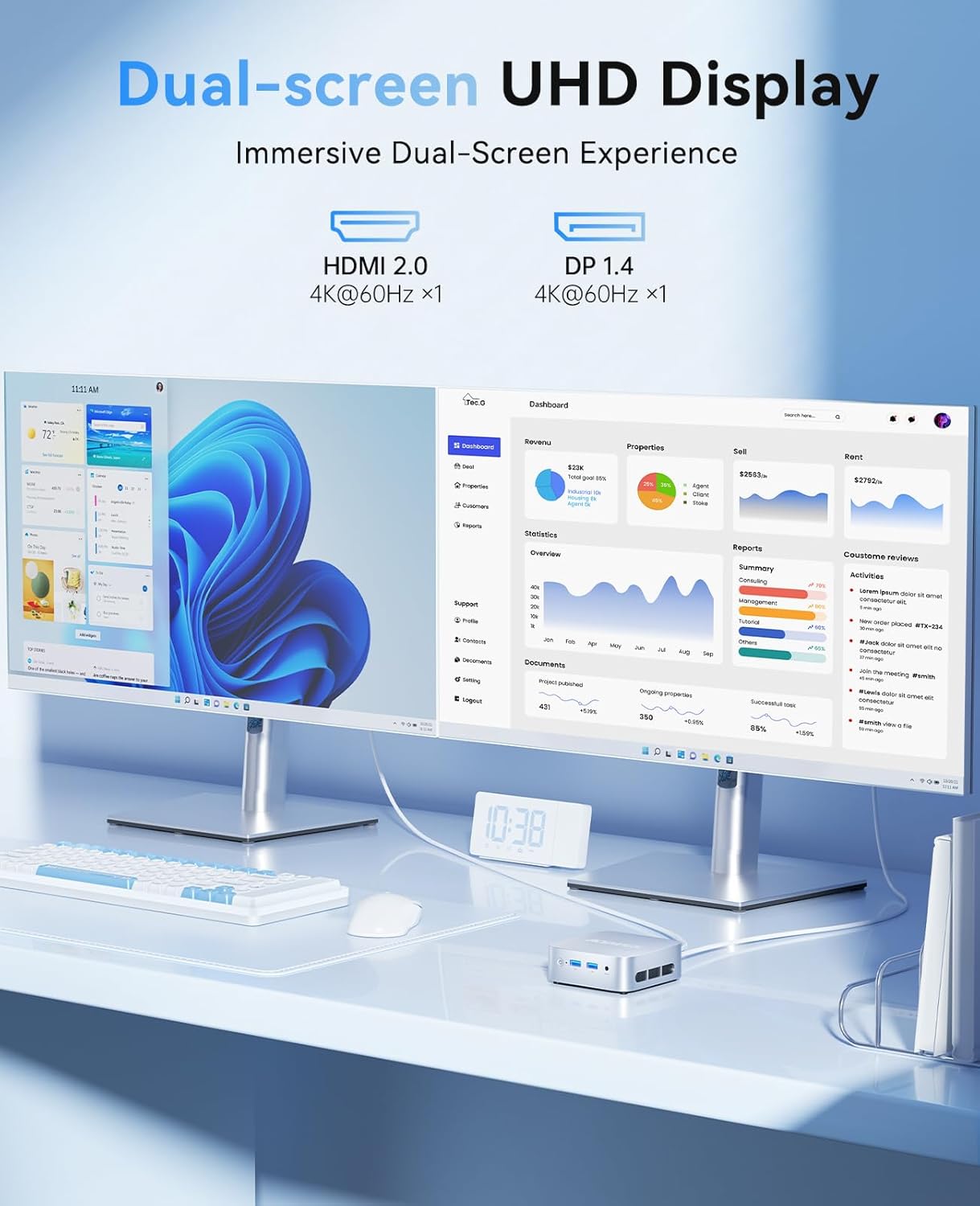 • ????[UHD-Grafik & 4K-Dual-Bildschirm-Anzeige] - Der N97 Multimedia-Server Mini-PC ist mit Intel UHD-Grafik (Grafik Max Dynamische Frequenz 1,20 GHz, Ausführungseinheiten 24EUs) ausgestattet, die eine schnellere Bildverarbeitungsgeschwindigkeit und 4K UHD-Videowiedergabefähigkeiten gewährleistet. Mit 1x HDMI 2.0 und 1x DP-Schnittstellen unterstützt er die Dual-Anzeige, schafft einen größeren Arbeitsbereich und ermöglicht Ihnen, 4K UHD-Bildqualität und Unterhaltung sowie doppelte Arbeitseffizienz zu genießen.