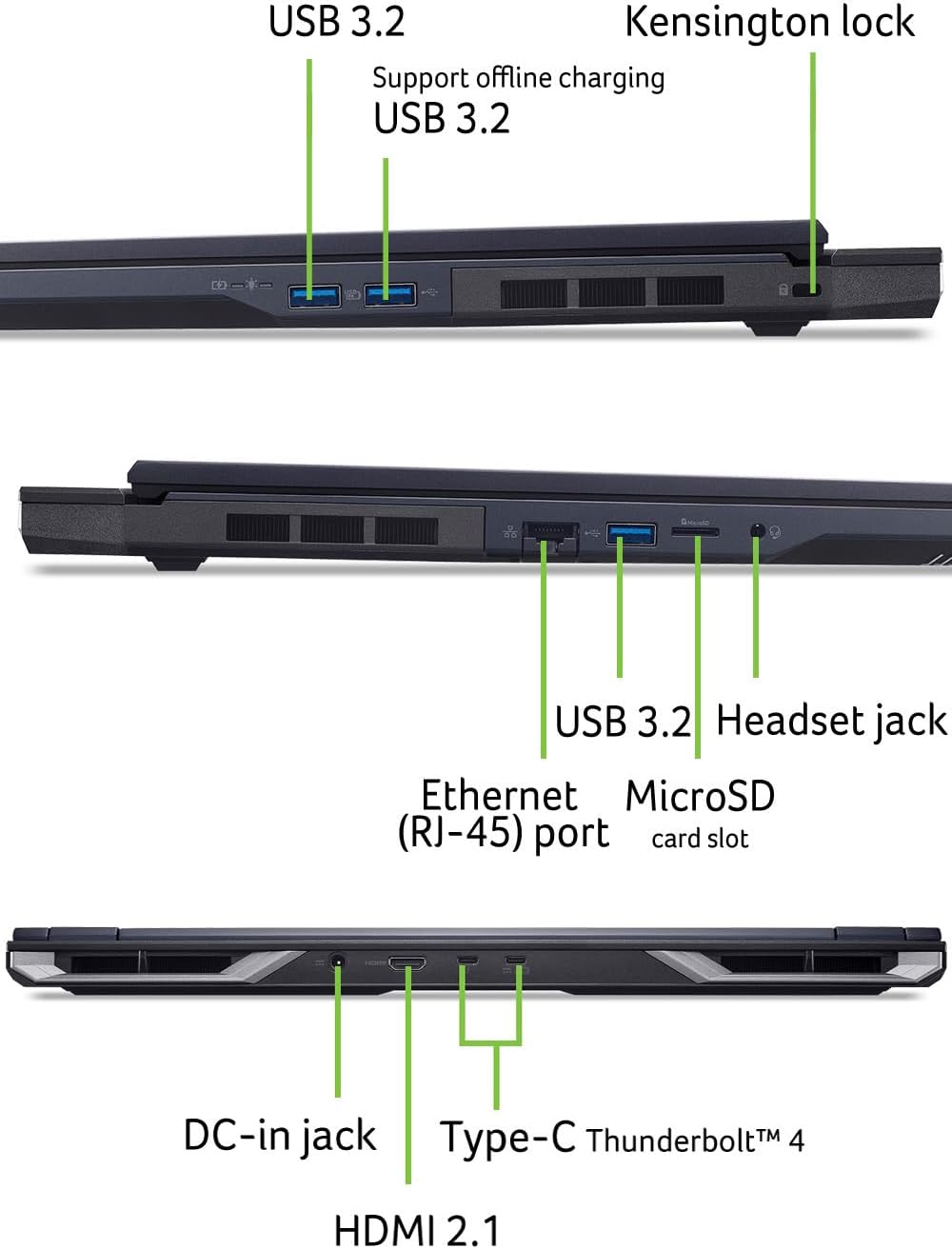 • ВРЪЗКИ: 1x HDMI, DisplayPort през USB Type-C, Thunderbolt 4 през USB Type-C, 5x USB 3.2 (2x USB Type-C Thunderbolt 4, 1x USB Type-A Gen 1, 2x USB Type-A Gen 2 (1x с USB зареждане при изключено захранване), Killer LAN 3100G, четец на карти, 1x 3.5 мм високоговорител/слушалки/изход (поддържа слушалки с вграден микрофон) БЕЗЖИЧНА МРЕЖА: Bluetooth 5.3, WLAN