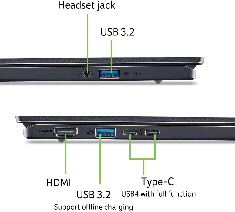 • ВРЪЗКИ: 1x HDMI, DisplayPort чрез USB Type-C, 2x Thunderbolt 4 чрез USB Type-C, 2x USB 4.0 Type-C, 2x USB 3.2 USB Type-A Gen.1 (1x с USB зареждане при изключване), Четец на карти, 1x Аудио жак, БЕЗЖИЧНА ВРЪЗКА: Bluetooth 5.3, WLAN