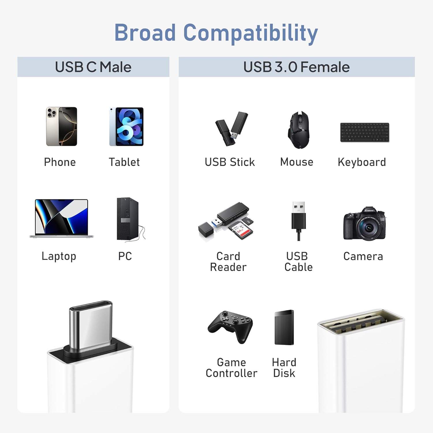 • (Лесен за употреба) Превърнете USB-C портовете на всички ваши устройства в USB-A портове с този OTG адаптер, осигурявайки им необходимия интерфейс за взаимодействие с традиционните ви устройства, които имат USB-A порт. Просто включете USB-C конектора в съответния порт на вашето устройство и сте готови.