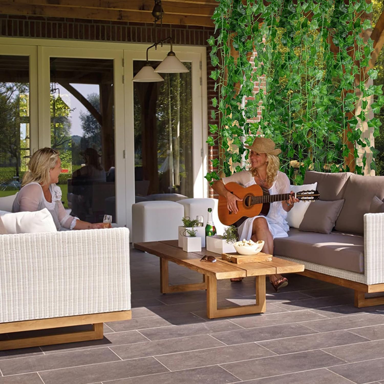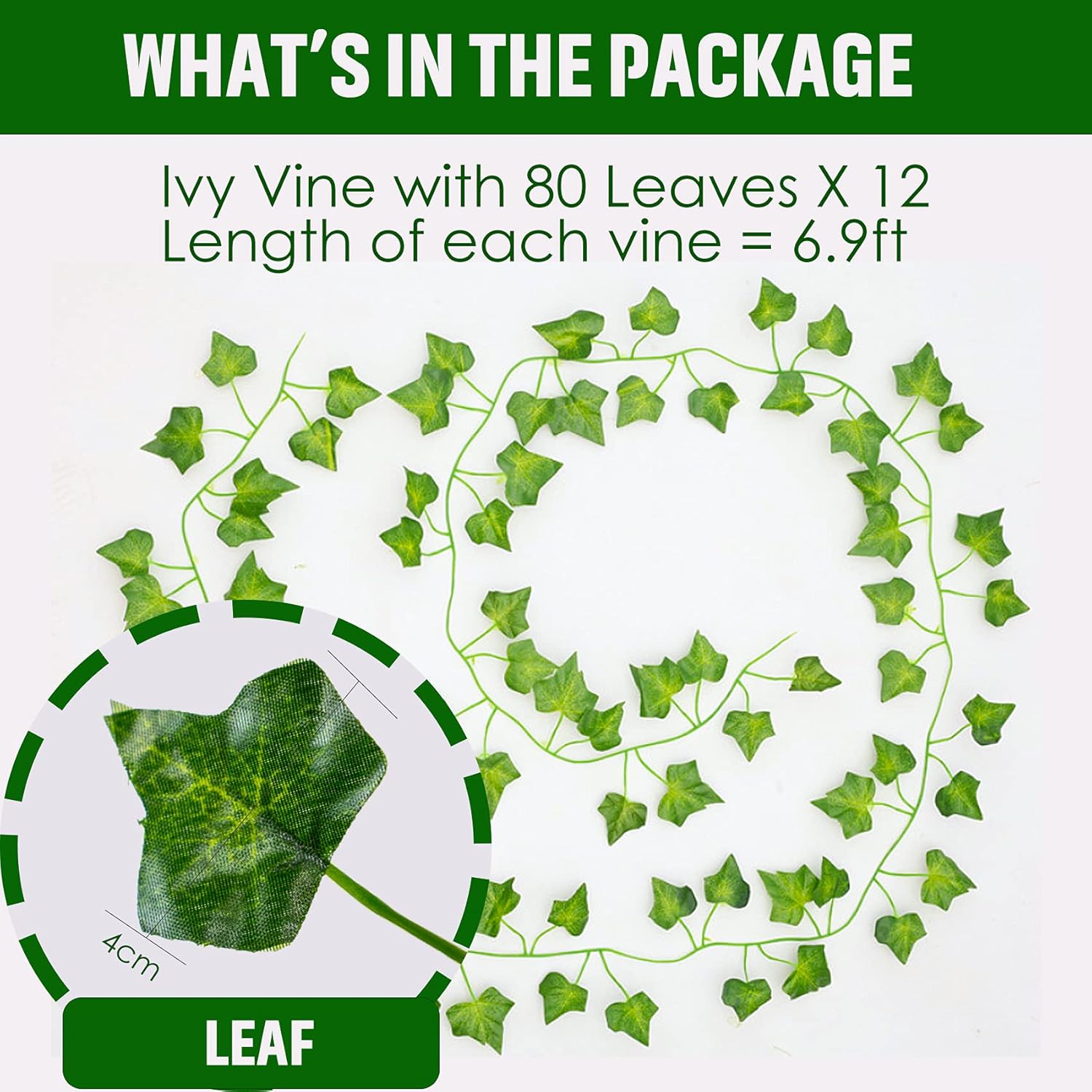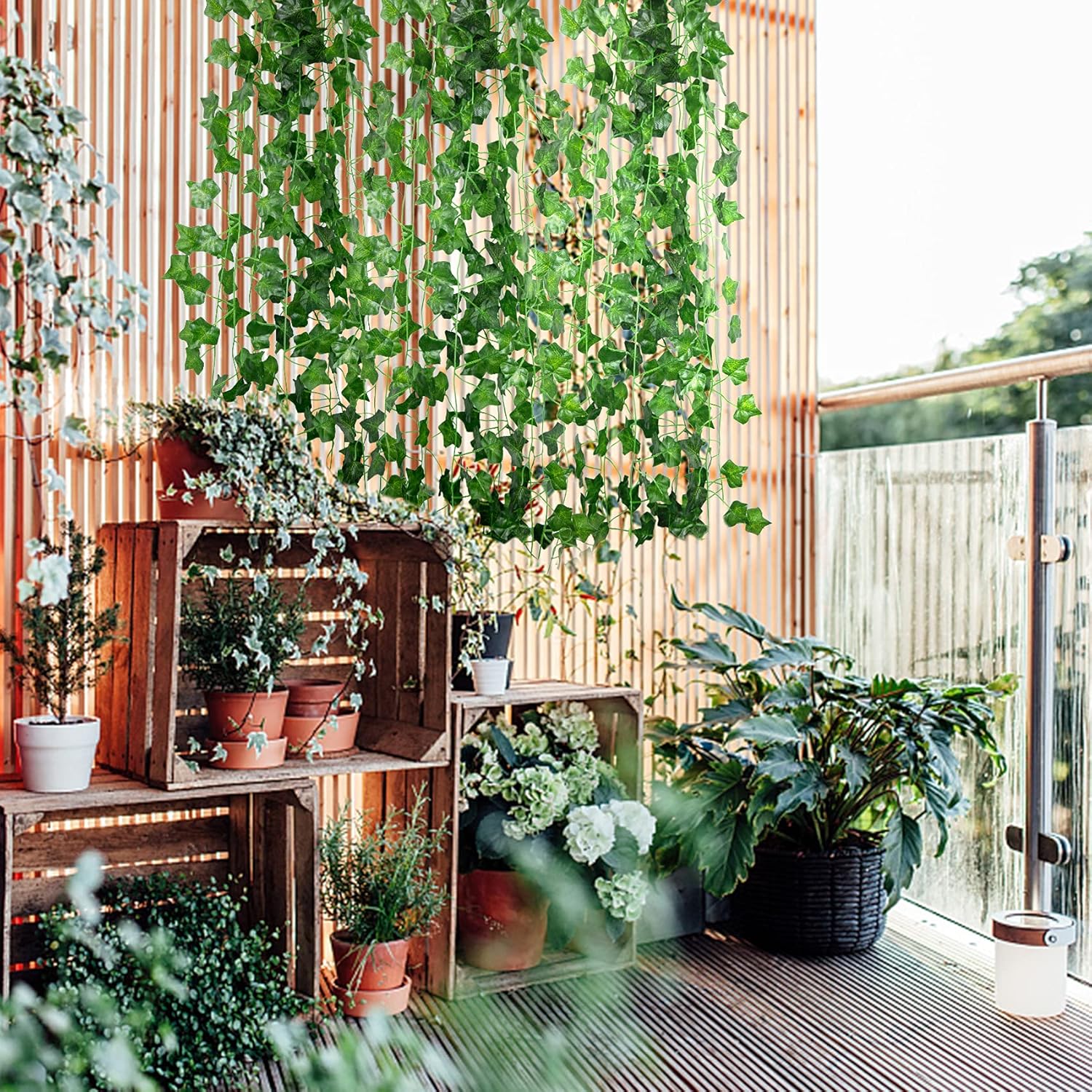ADORAMOUR Изкуствени гирлянди от бръшлян - пакет от 12, дължина 210 см - изкуствени лози за декорация на стени в стая и градина за вътрешна и външна употреба, зелени листа от пластмаса, висящи растения за декорация със зелени растения