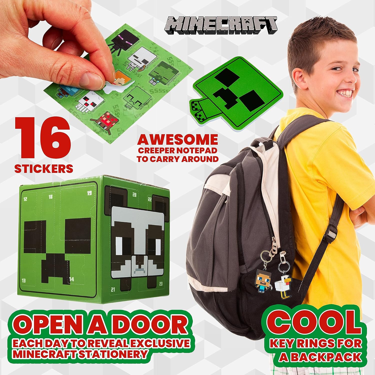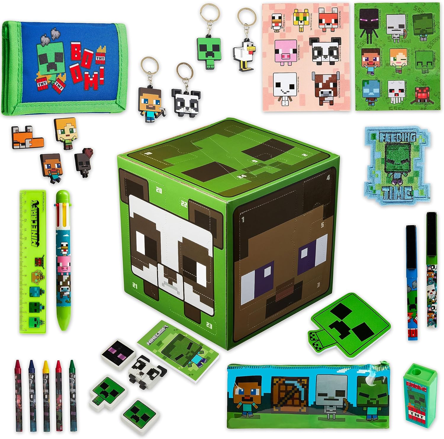 Адвент календар на Minecraft за деца 2025, Училищни пособия, 24 изненади с химикалки, гумичка и още аксесоари, Подаръци за момчета с Creeper (зелен куб)