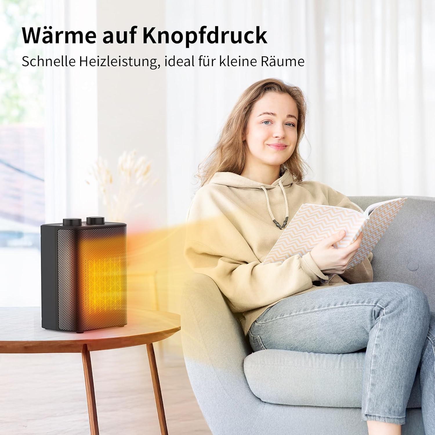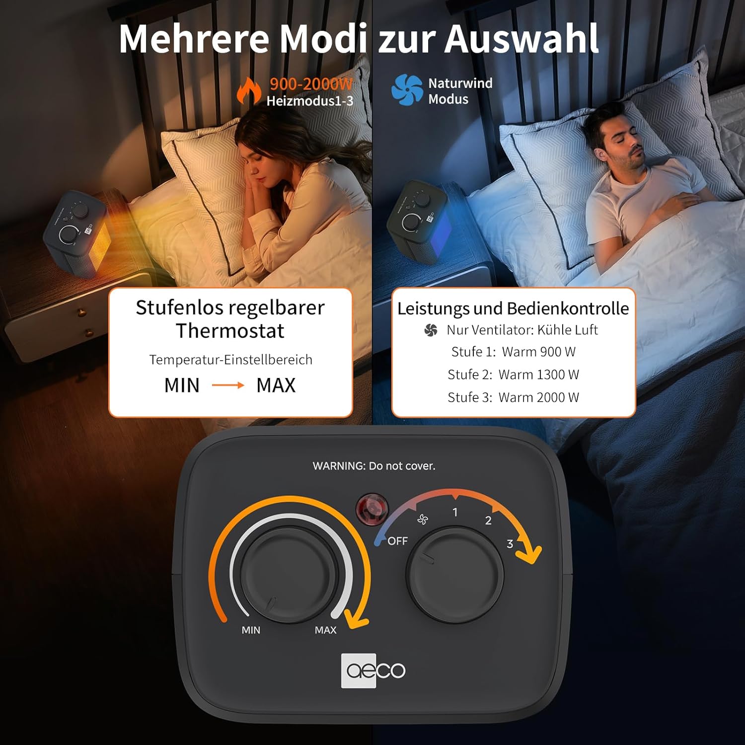 aeco EcoHeat One вентилаторен нагревател, малък, 2000 W, енергоспестяващ, 3 степени на отопление, електрически нагревател, PTC керамичен термостат, защита от прегряване и накланяне, функция на вентилатора, бързо отопление, компактен домашен нагревател
