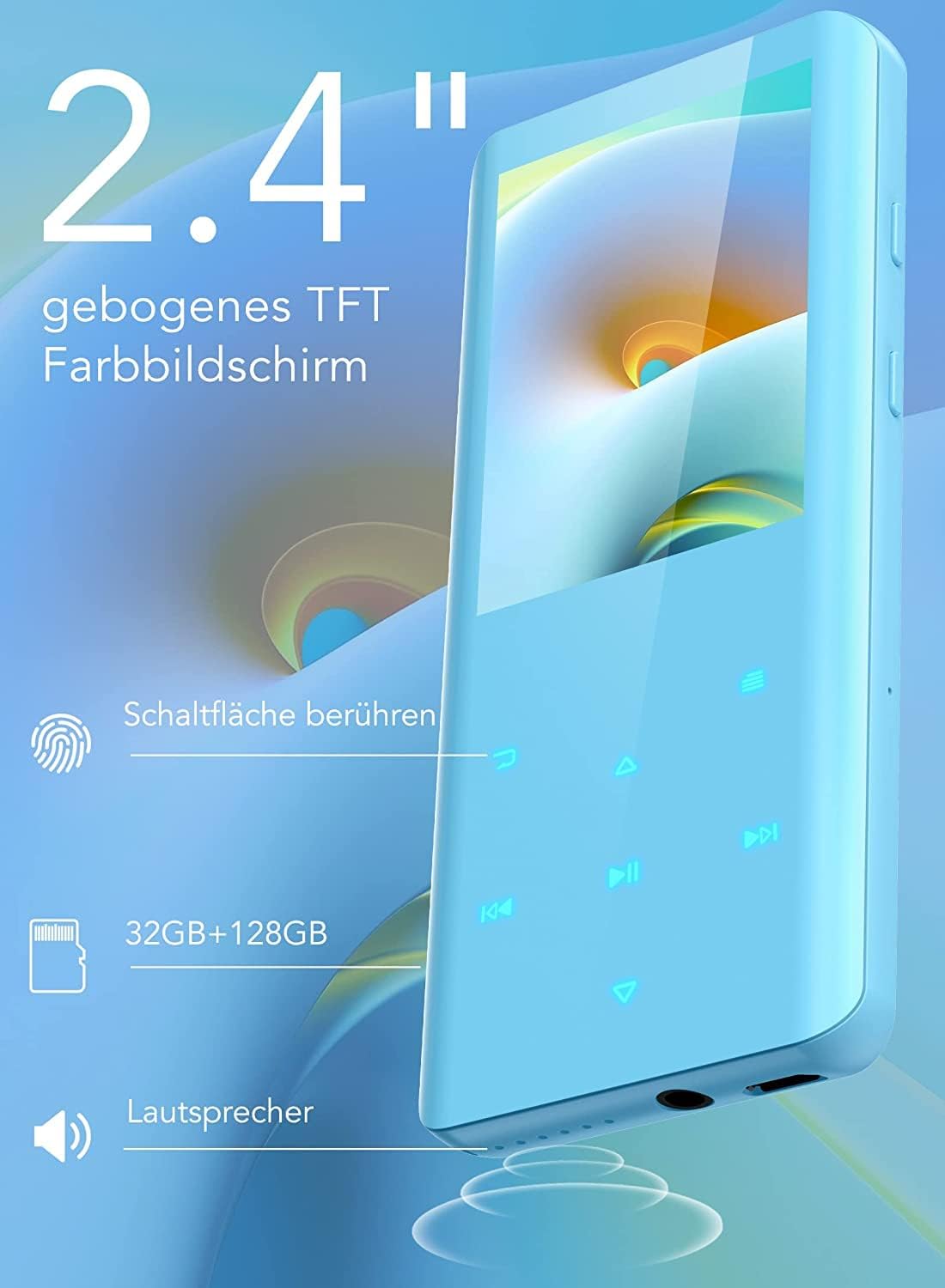 • 2.4-инчов TFT цветен екран, 64 + 128 GB голяма памет: ясен и красив дисплей, ниска консумация на енергия, по-голяма икономия на енергия. Извитият дизайн на екрана го прави по-елегантен и лесен за използване. MP4 плейърът се предлага с 64 GB памет. Поддържа и 128GB TF карта (не съдържа TF карта), която може да съхранява музика в големи количества.