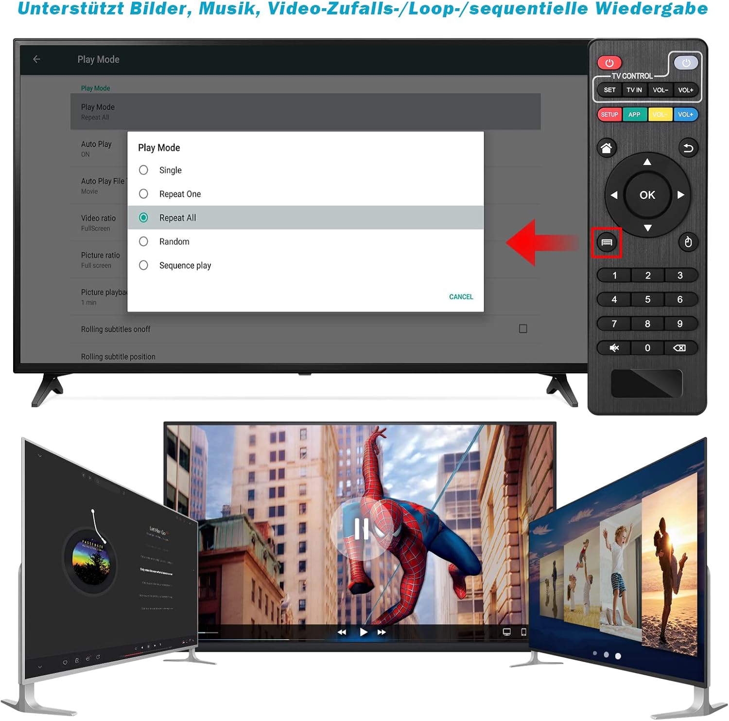 • Поддържа възпроизвеждане на видеоклипове/снимки/музика/PPT и в автоматичен/цикъл режим: този 4K медиен плейър може да възпроизвежда различни популярни видеоклипове, музика и снимки. Той има режим на многократно възпроизвеждане, автоматично възпроизвеждане и разбъркано възпроизвеждане; също така чете PPT документи. Можете да избирате от различни режими на възпроизвеждане: единичен, последователен. Поддържа точка на прекъсване на видеото и избиране на режим от самото начало, можете да стартирате домашното си кино по желание.