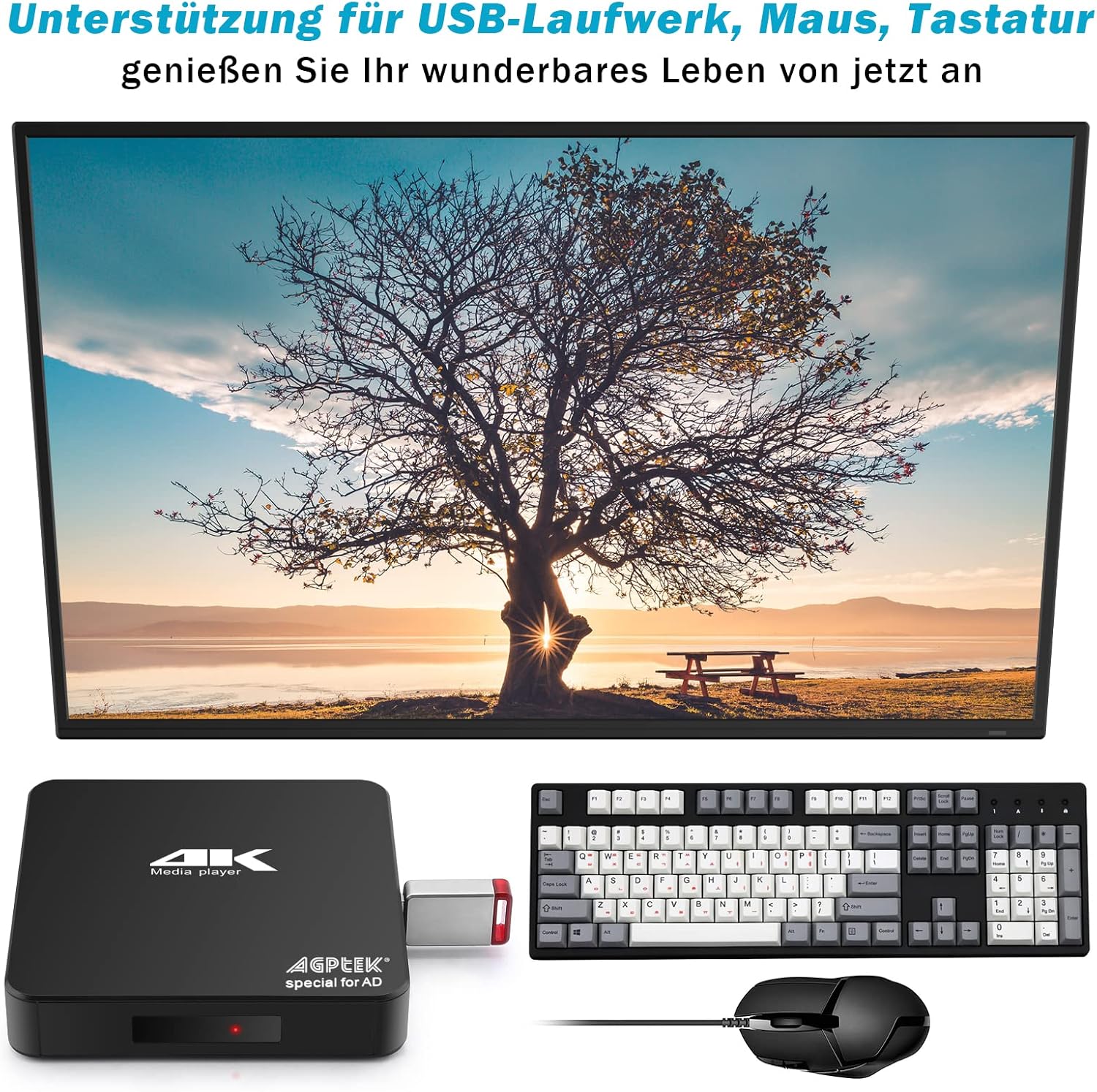 AGPTEK 4K@60hz MP4 медиен плейър, поддържащ 8TB HDD/256G USB устройство/SD карта с HDMI/AV изход за HDTV/PPT MKV AVI MP4 H.265, поддържа реклами, субтитри/тайминг и управление от клавиатура