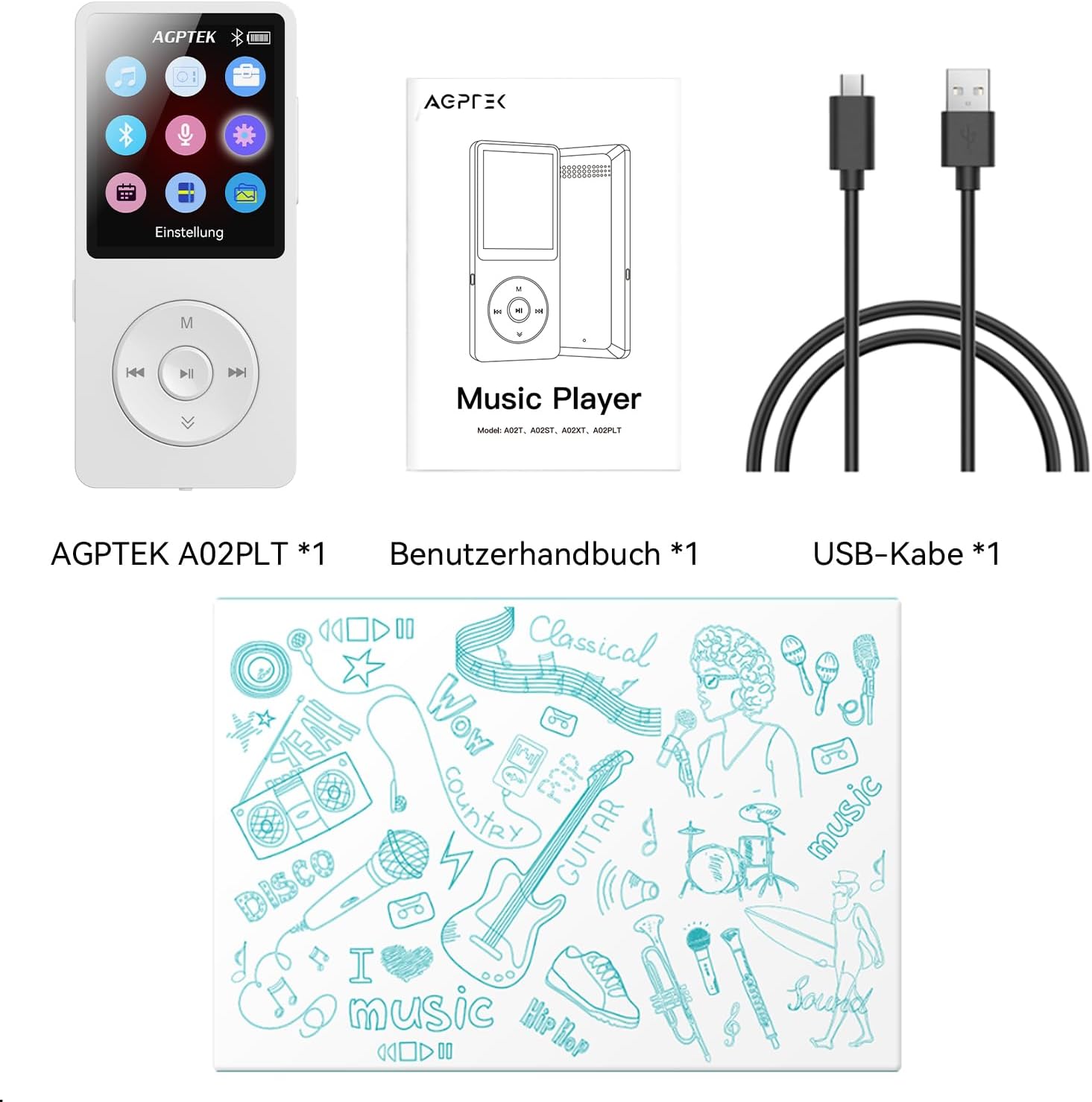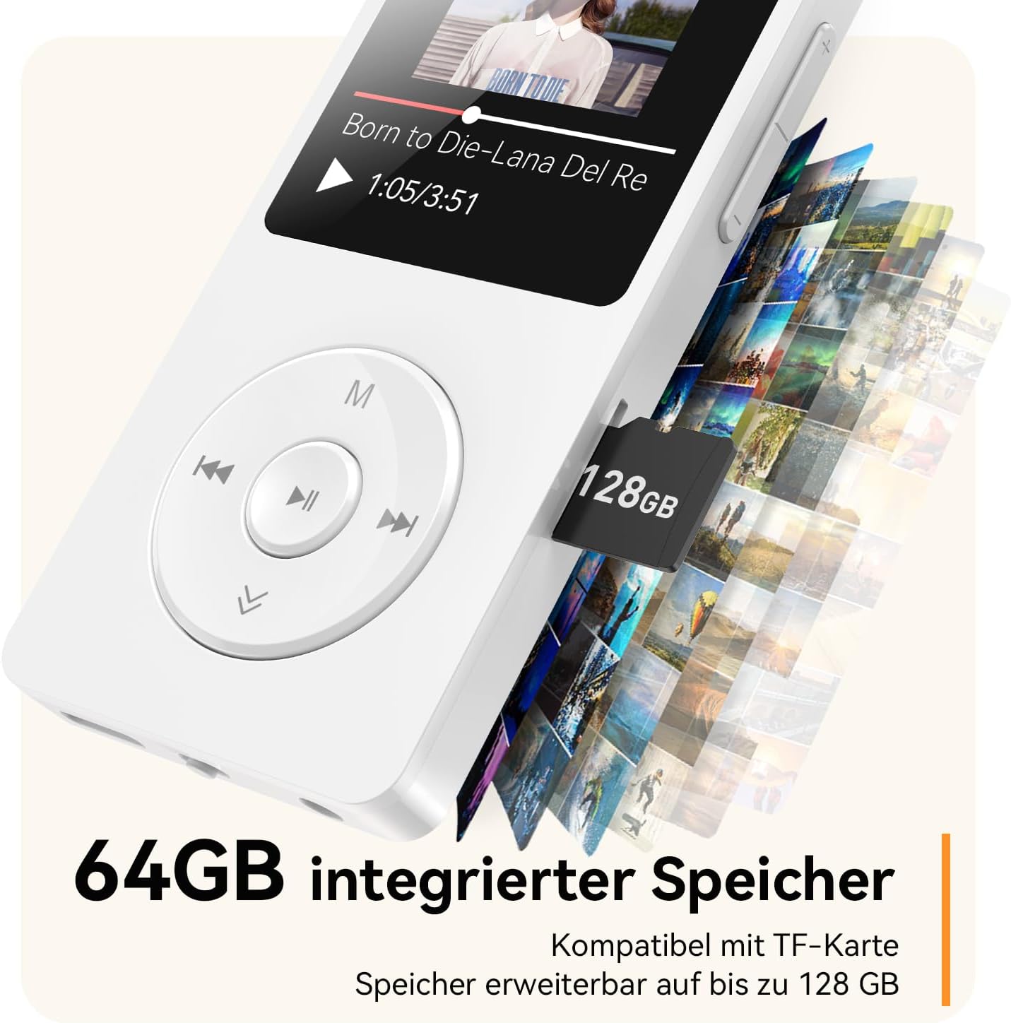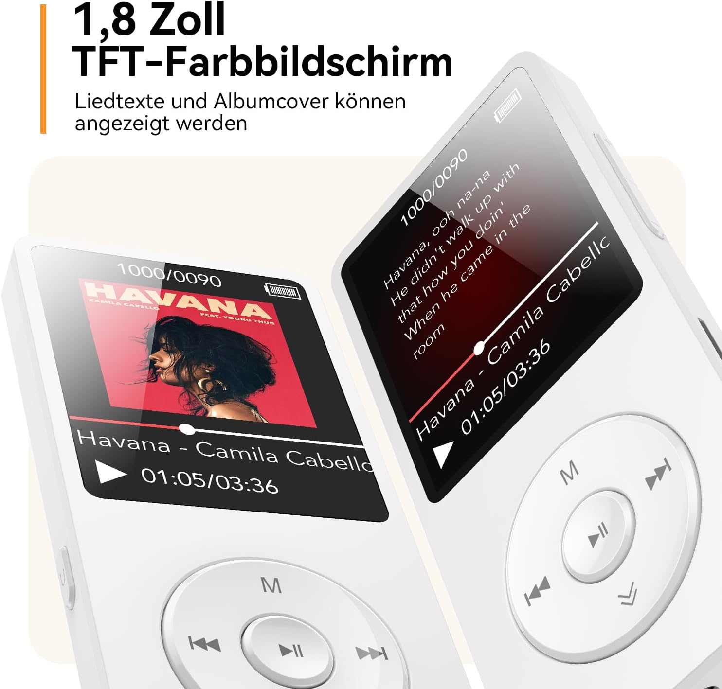 AGPTEK 64 GB MP3 плейър Bluetooth 5.3 с високоговорител, 40 часа живот на батерията, малък и класически спортен MP3 с 1.8-инчов екран, FM радио (без слушалки), TF карта до 128 GB, бял