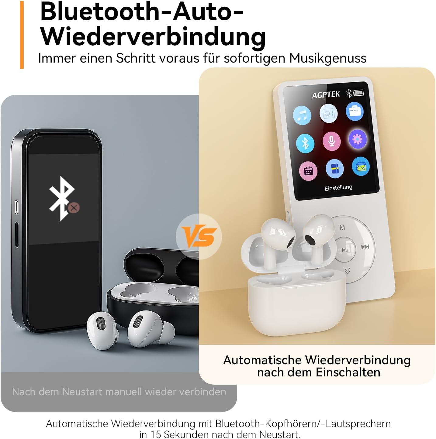 • Bluetooth 5.3 технология: MP3 плейърът използва модерна Bluetooth 5.3 технология за по-добра съвместимост, стабилен сигнал и намалена консумация на енергия. Лесно сдвояване с Bluetooth слушалки или високоговорители. Забележка: Не свързвайте директно със смартфони/таблети или Bluetooth за кола - използвайте AUX порта за автомобили.