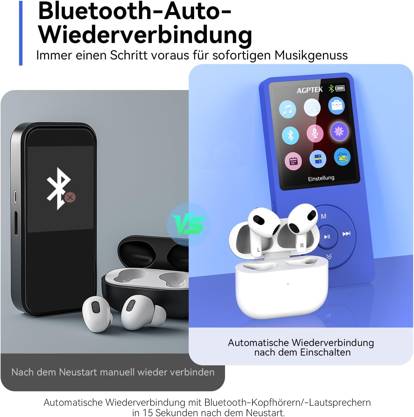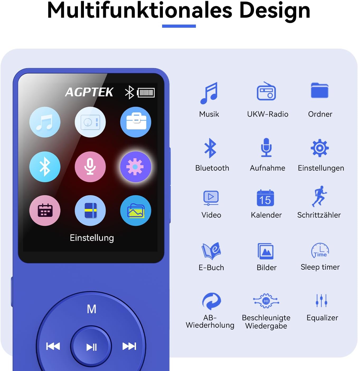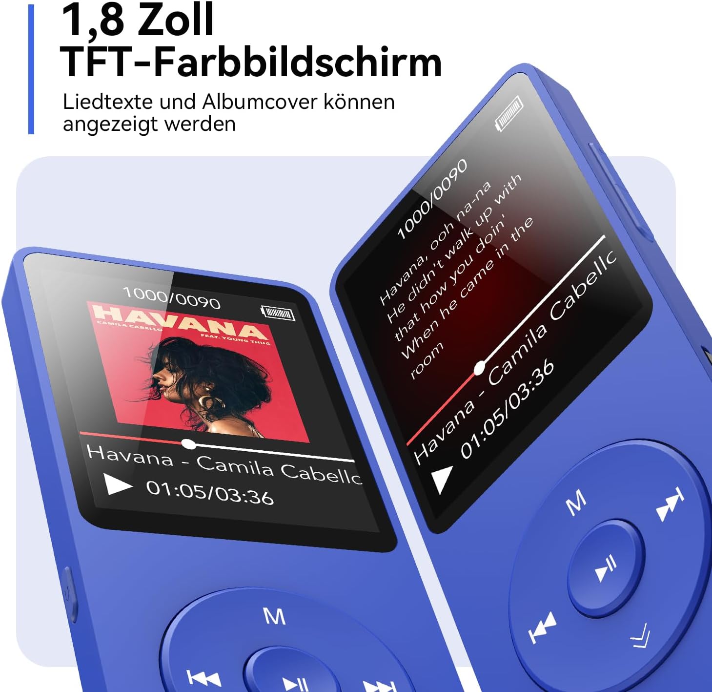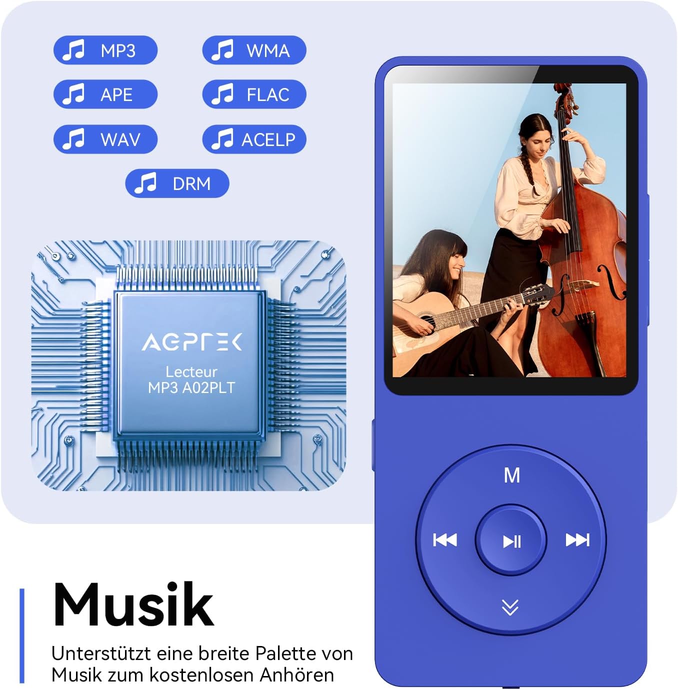 AGPTEK 64 GB MP3 плейър Bluetooth 5.3 с високоговорител, 40 часа живот на батерията, малък и класически спортен MP3 с 1.8-инчов екран, FM радио (без слушалки), TF карта до 128 GB, син