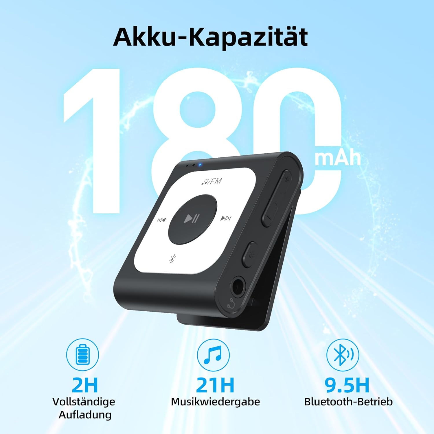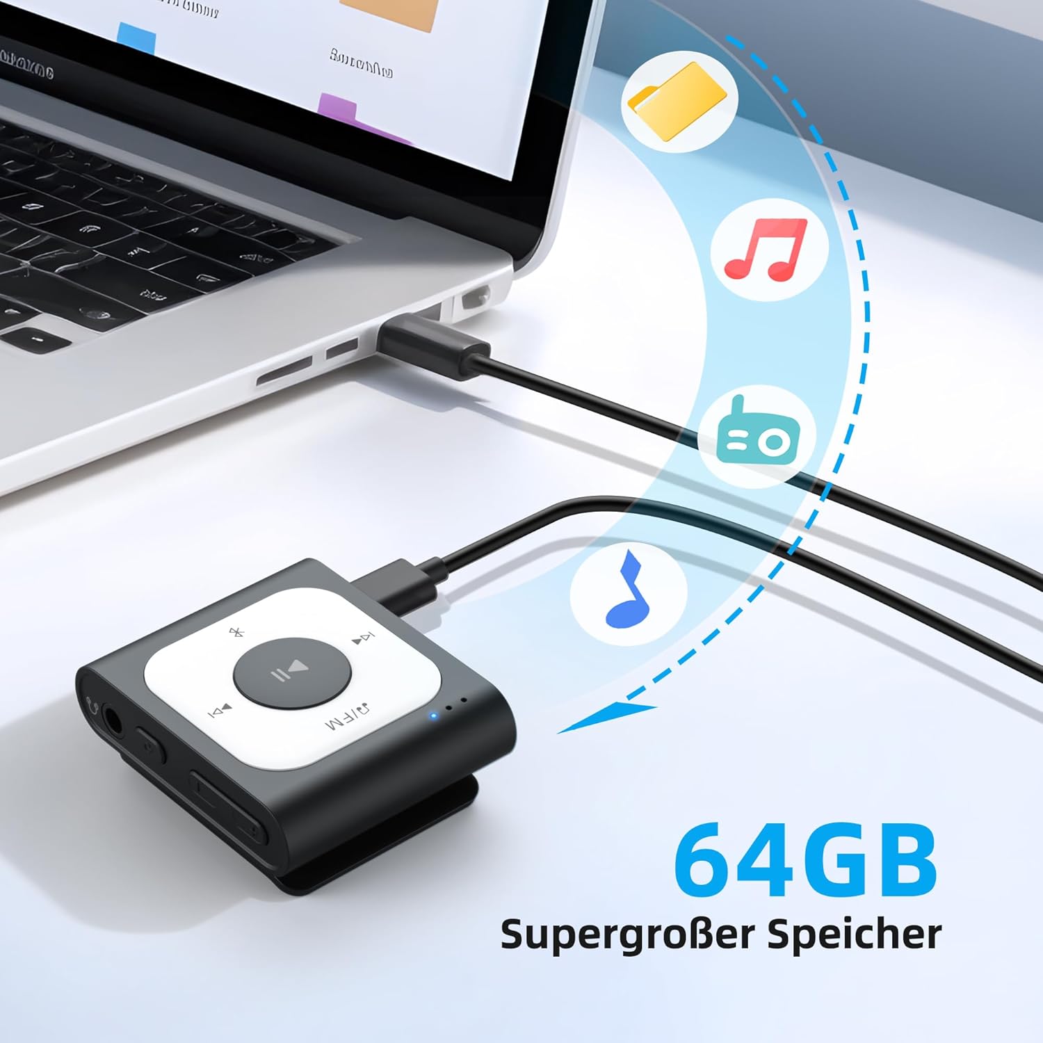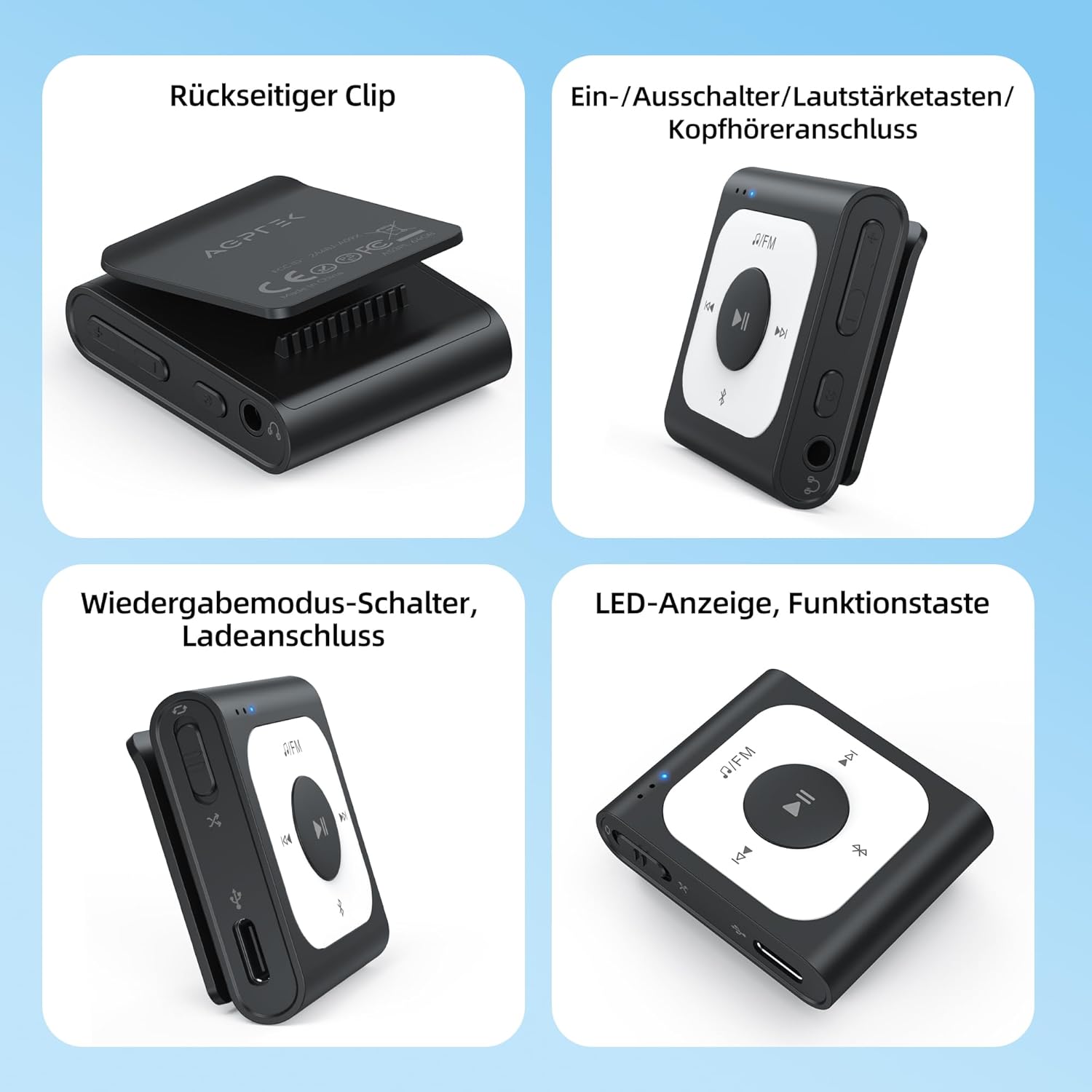 AGPTEK 64GB MP3 плейър Bluetooth 5.3 с щипка, мини преносим музикален плейър с FM радио, произволно възпроизвеждане, лесен за употреба, не е необходим телефон за спорт, черен