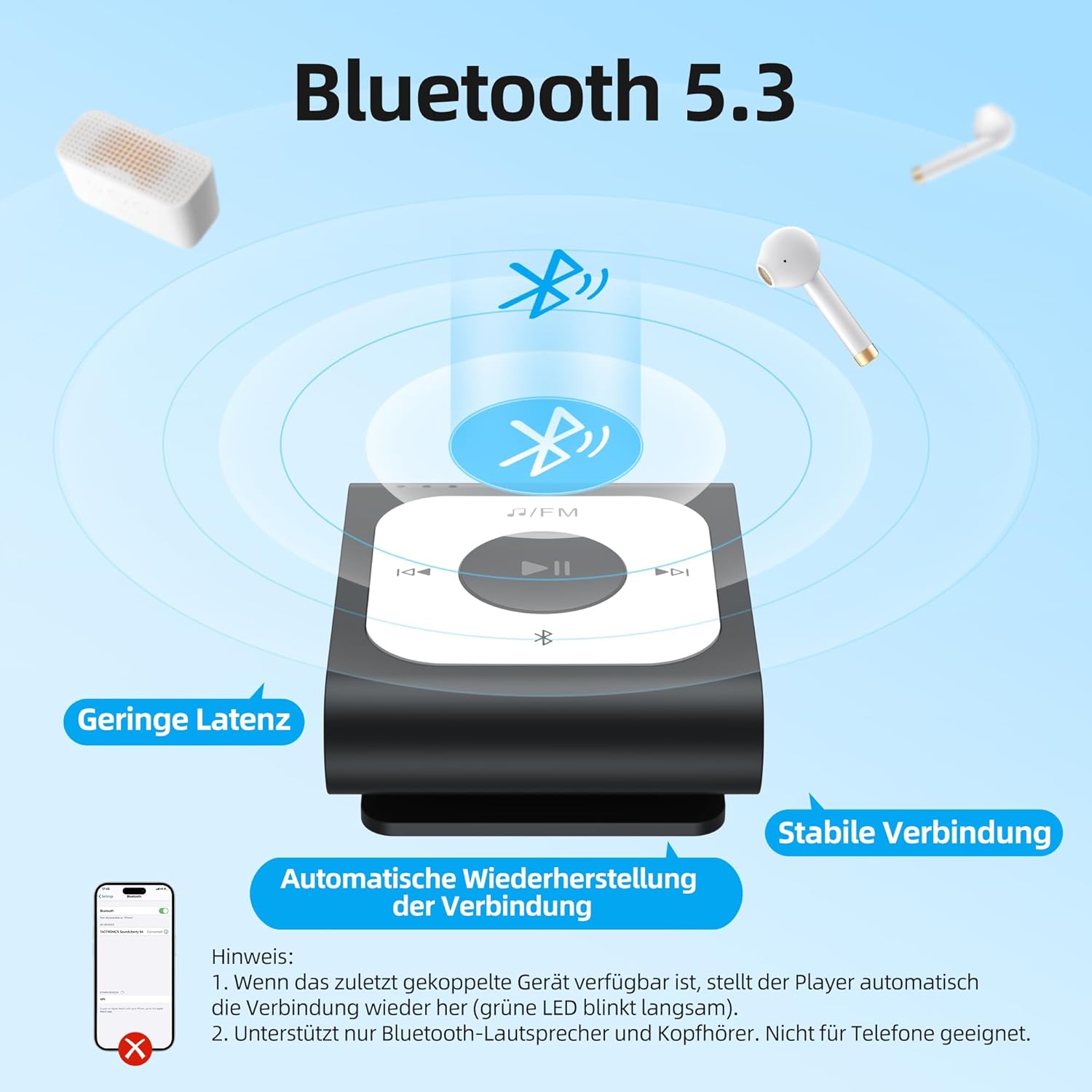 • Безжичен Bluetooth 5.3 - MP3 плейърът използва подобрен Bluetooth 5.3 за по-добра съвместимост. Просто включете Bluetooth устройството, което ще бъде сдвоено, и натиснете бутона Bluetooth, за да се свържете. (Функция за надграждане: ако последното сдвоено устройство е все още налично, плейърът автоматично ще се свърже отново.)