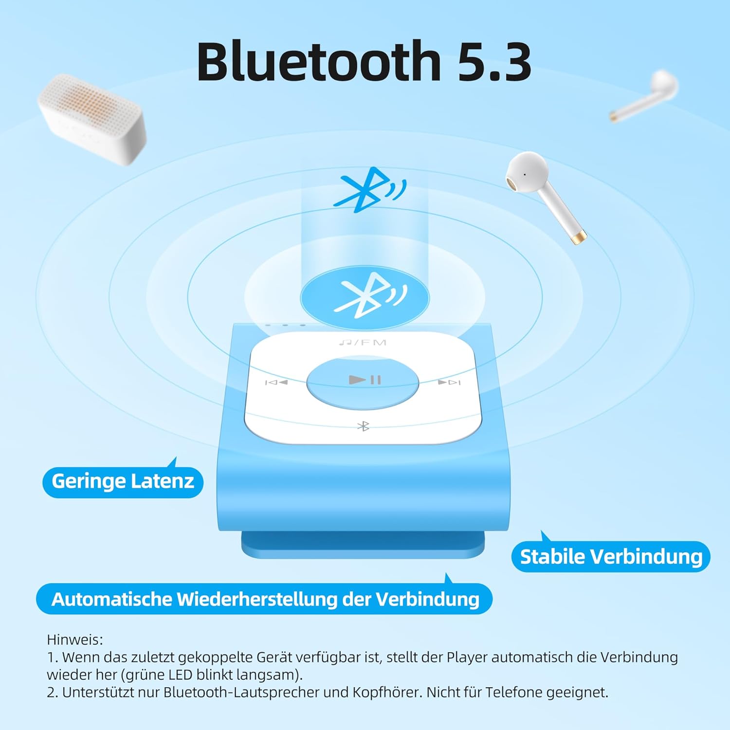 • Безжичен Bluetooth 5.3 - MP3 плейърът използва подобрен Bluetooth 5.3 за по-добра съвместимост. Просто включете Bluetooth устройството, което ще бъде сдвоено, и натиснете бутона Bluetooth, за да се свържете. (Функция за надграждане: ако последното сдвоено устройство е все още налично, плейърът автоматично ще се свърже отново.)
