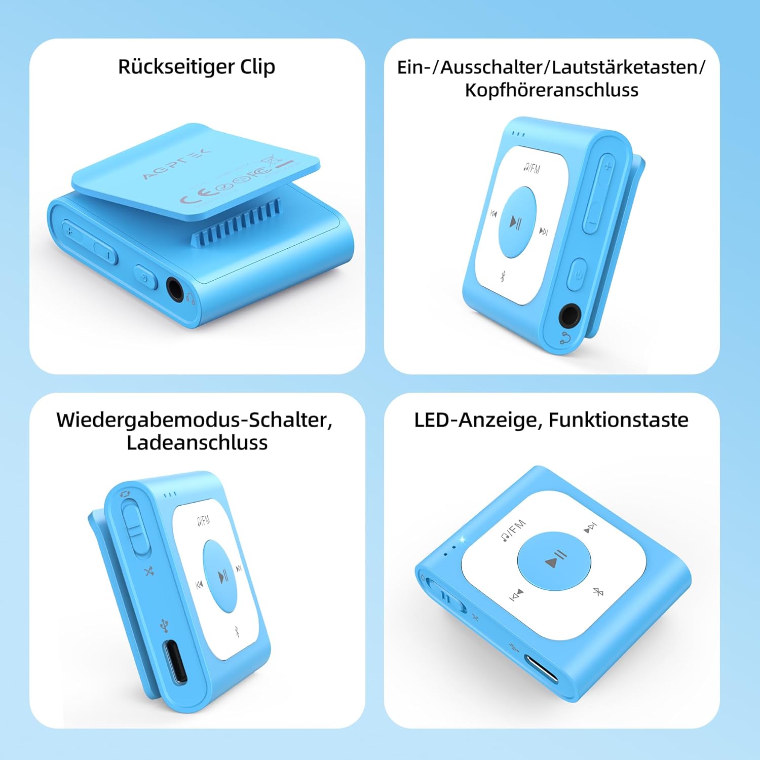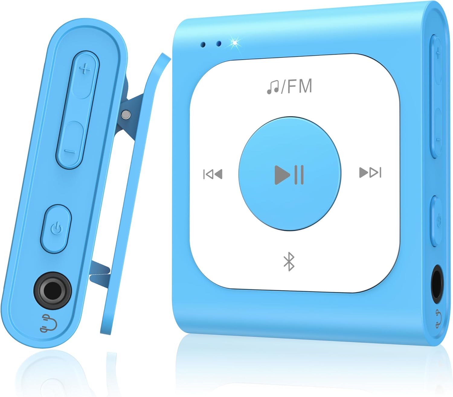 AGPTEK 64GB MP3 плейър Bluetooth 5.3 с щипка, мини преносим музикален плейър с FM радио, произволно възпроизвеждане, лесен за употреба, не е необходим телефон за спорт, син
