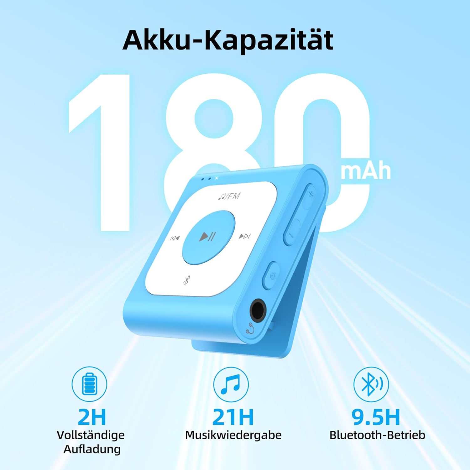 • 21 часа време на работа - MP3 плейърът има батерия от 180 mAh, която може да се използва за приблизително 2 часа, когато е напълно заредена. При средна сила на звука, той позволява до 21 часа възпроизвеждане със слушалки. Забележка: В Bluetooth режим, времето е около 9,5 часа.