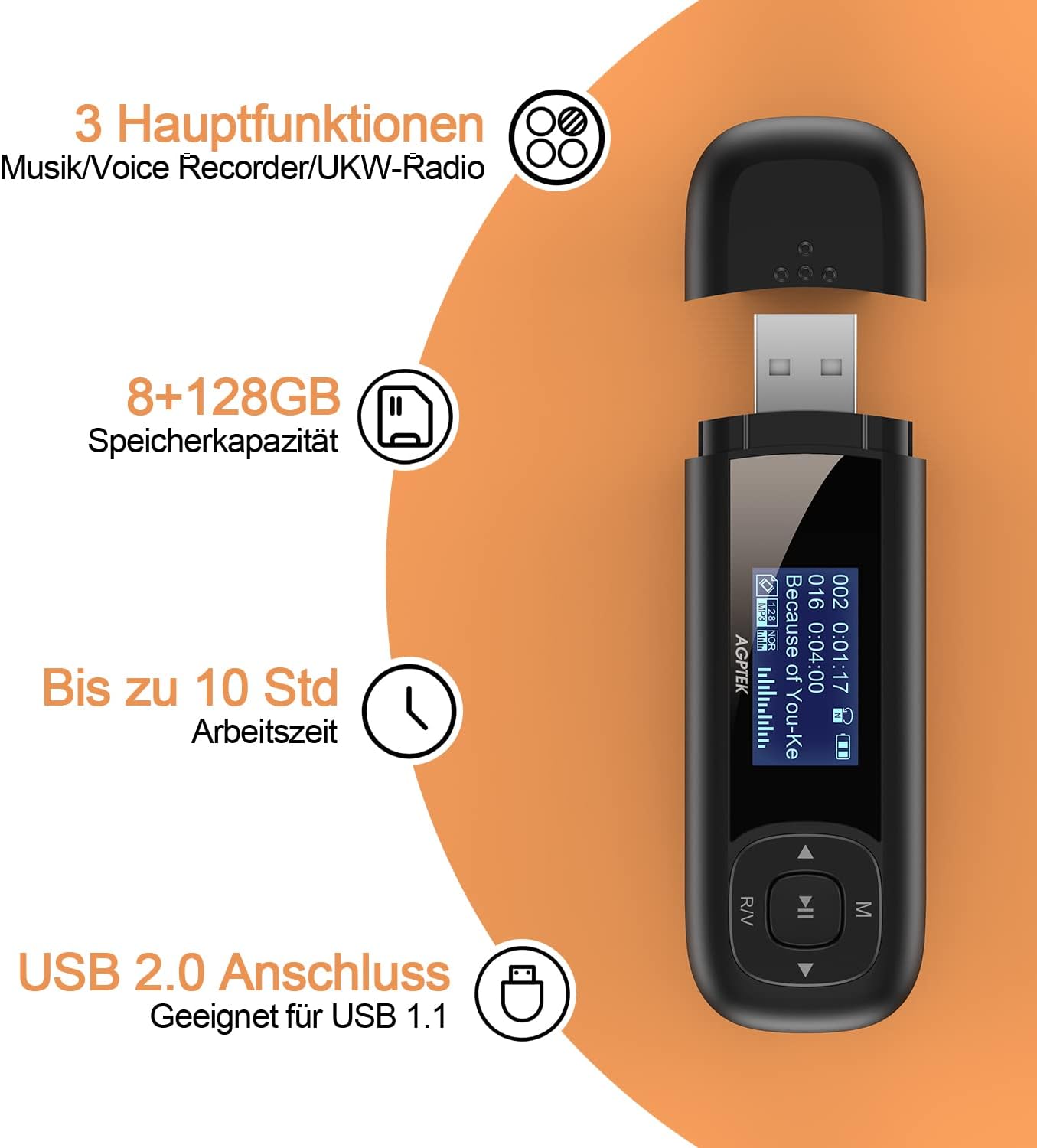 • 8GB памет и максимална поддръжка на карти с памет 128GB: самото устройство има 8G памет, около 1% за системна работа; при условие на достатъчен капацитет за съхранение, броят на песните може да бъде повече от 2000 песни; SD картата може да бъде разширена, максималната поддръжка е 128 GB. ЗАБЕЛЕЖКА: Не се предлага с карта с памет.