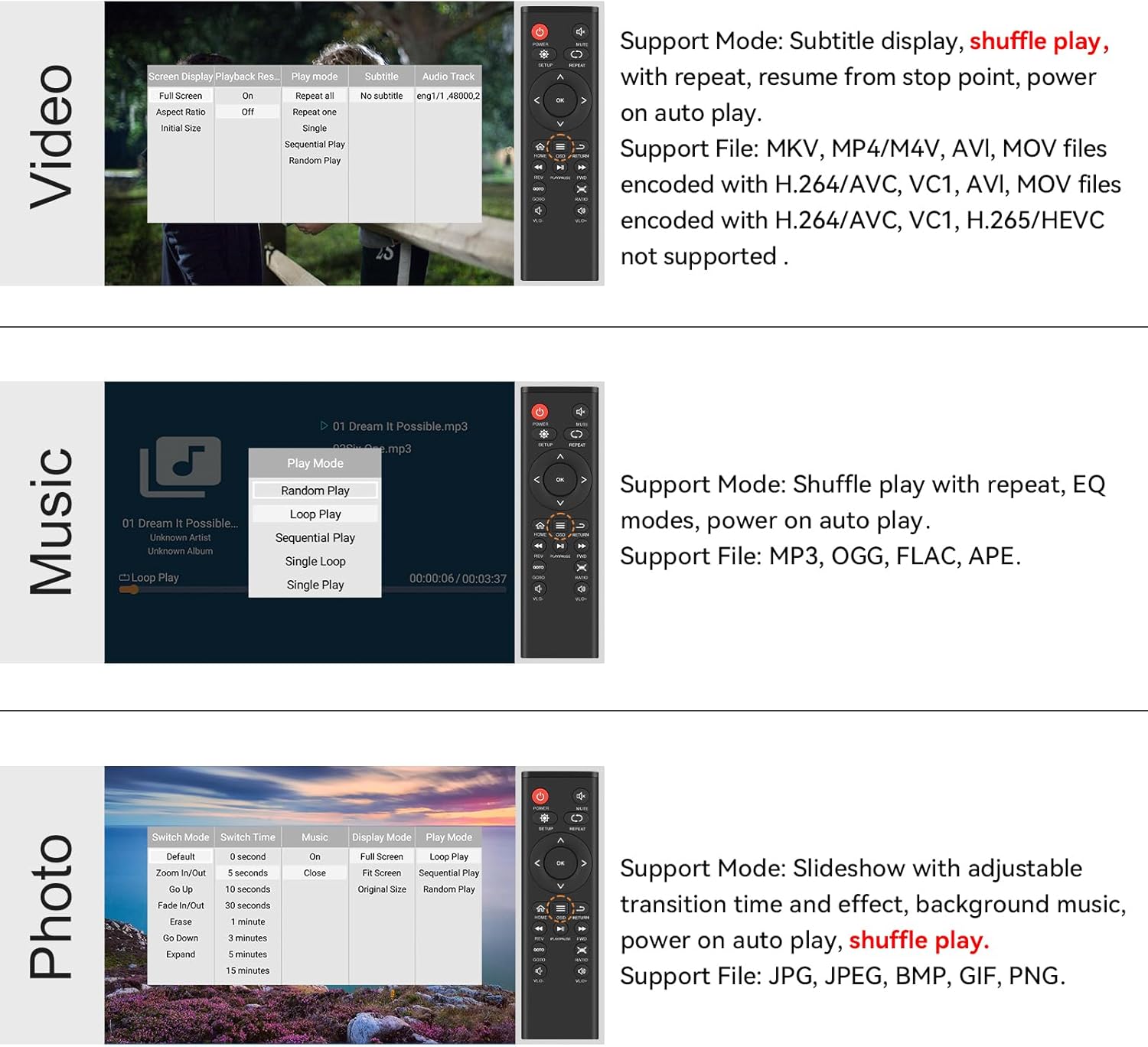 Видео формат: RM, RMVB, AVI, DIVX, MKV, MOV, HDMOV, MP4, M4V, PMP, AVC, FLV, VOB, MPG, DAT, MPEG, TS, TP, M2TS, WMV (H.264, H.263, WMV9/VC-1, MPEG1/2/4). H.264 MP4 форматът поддържа до 4GB на файл. Аудио формат: MP3, WMA, OGG, AAC, FLAC, APE, AC3, ATRA. Формати на субтитри: SMI, SSA, SRT, SUB. Формат на снимки: BMP, JPG, PNG, GIF (неподвижно изображение).